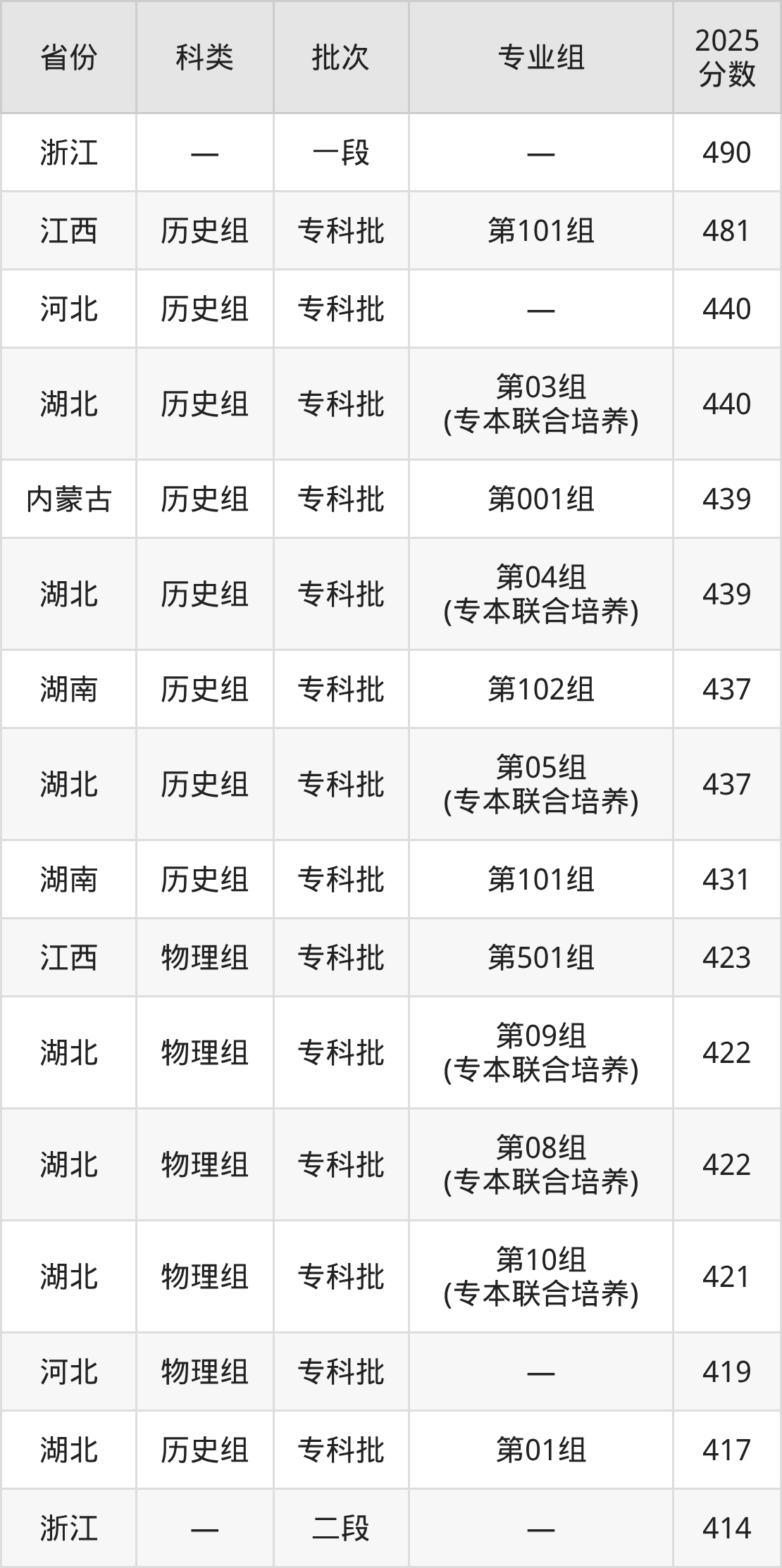 而浙江地区考生的分数门槛最高,2025年湖北财税职业学院在浙江招生最低分为490分,考生至少要超一段线0分才有可能被录取。