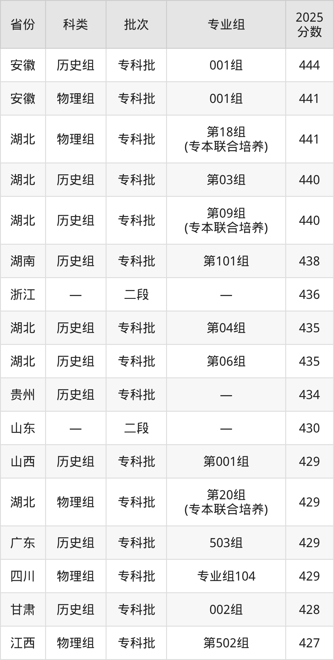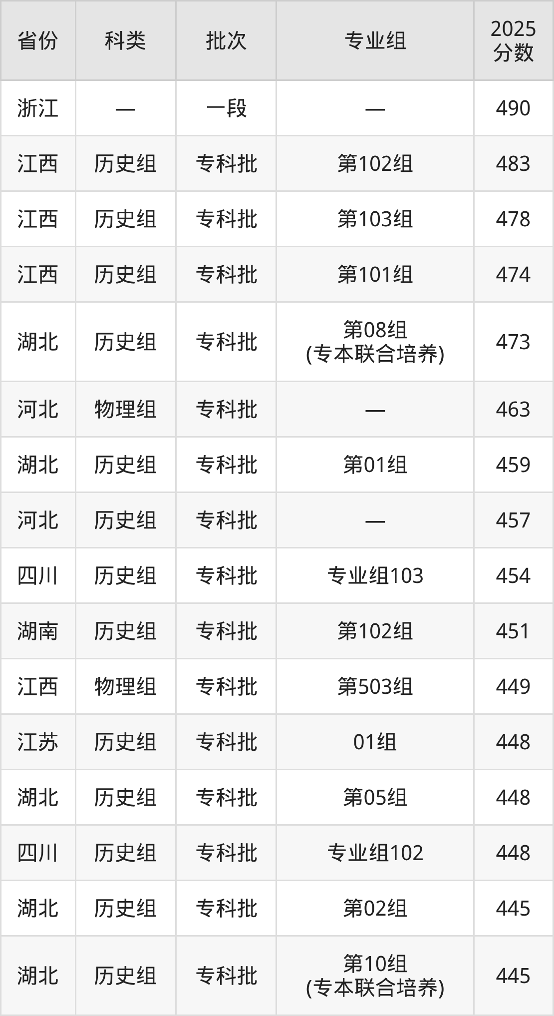 而浙江地区考生的分数门槛最高,2025年武汉城市职业学院在浙江招生最低分为490分,考生至少要超一段线0分才有可能被录取。