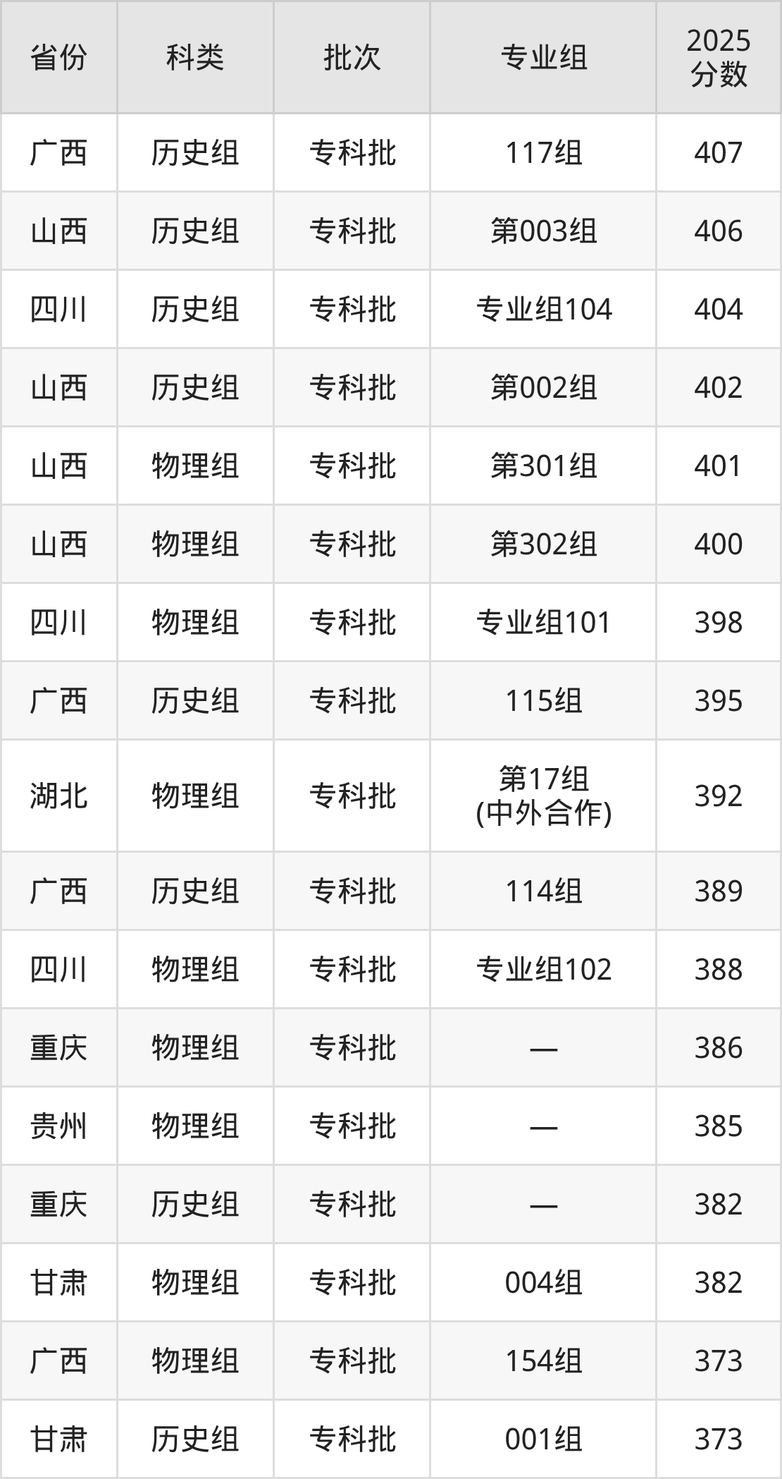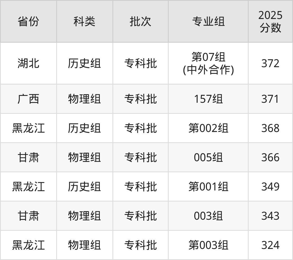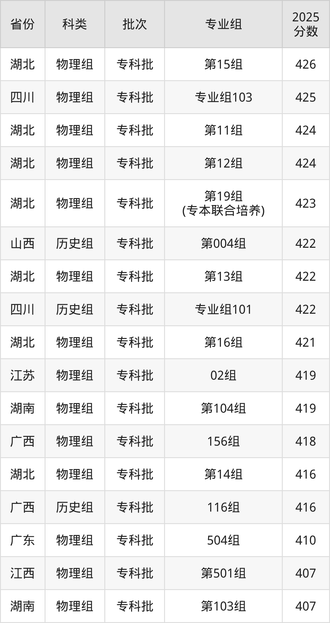 下面是武汉城市职业学院2025年在全国各省的录取分数线一览表,供参考: