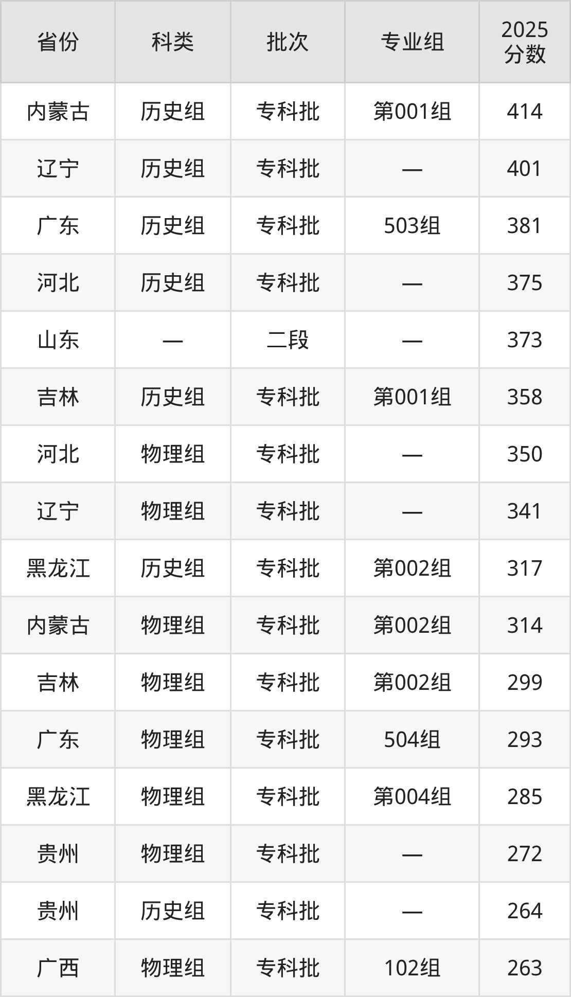 而内蒙古地区历史组考生的分数门槛最高,2025年黑龙江商业职业学院第001组在内蒙古招生最低分为414分,考生至少要超专科线254分才有可能被录取。