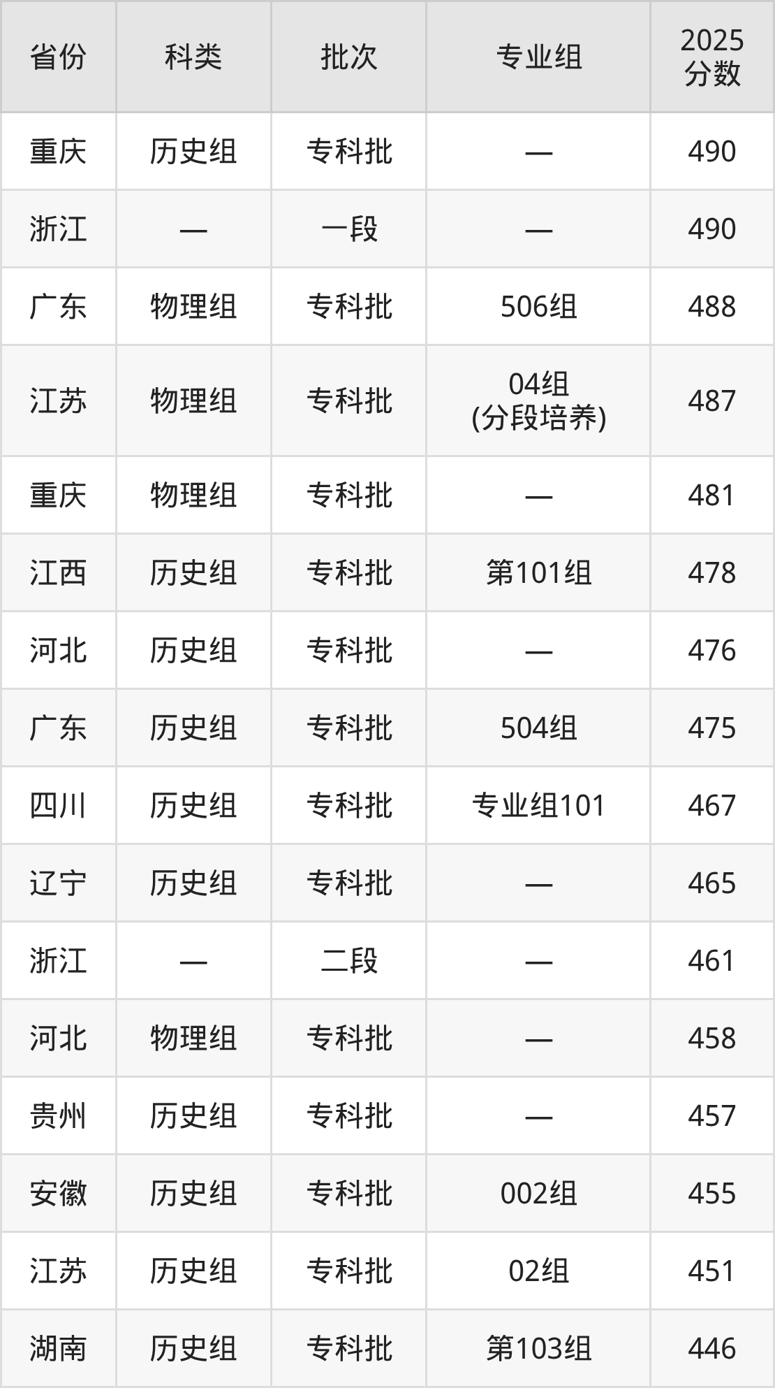 而重庆地区历史组考生的分数门槛最高,2025年江苏海事职业技术学院在重庆招生最低分为490分,考生至少要超专科线310分才有可能被录取。