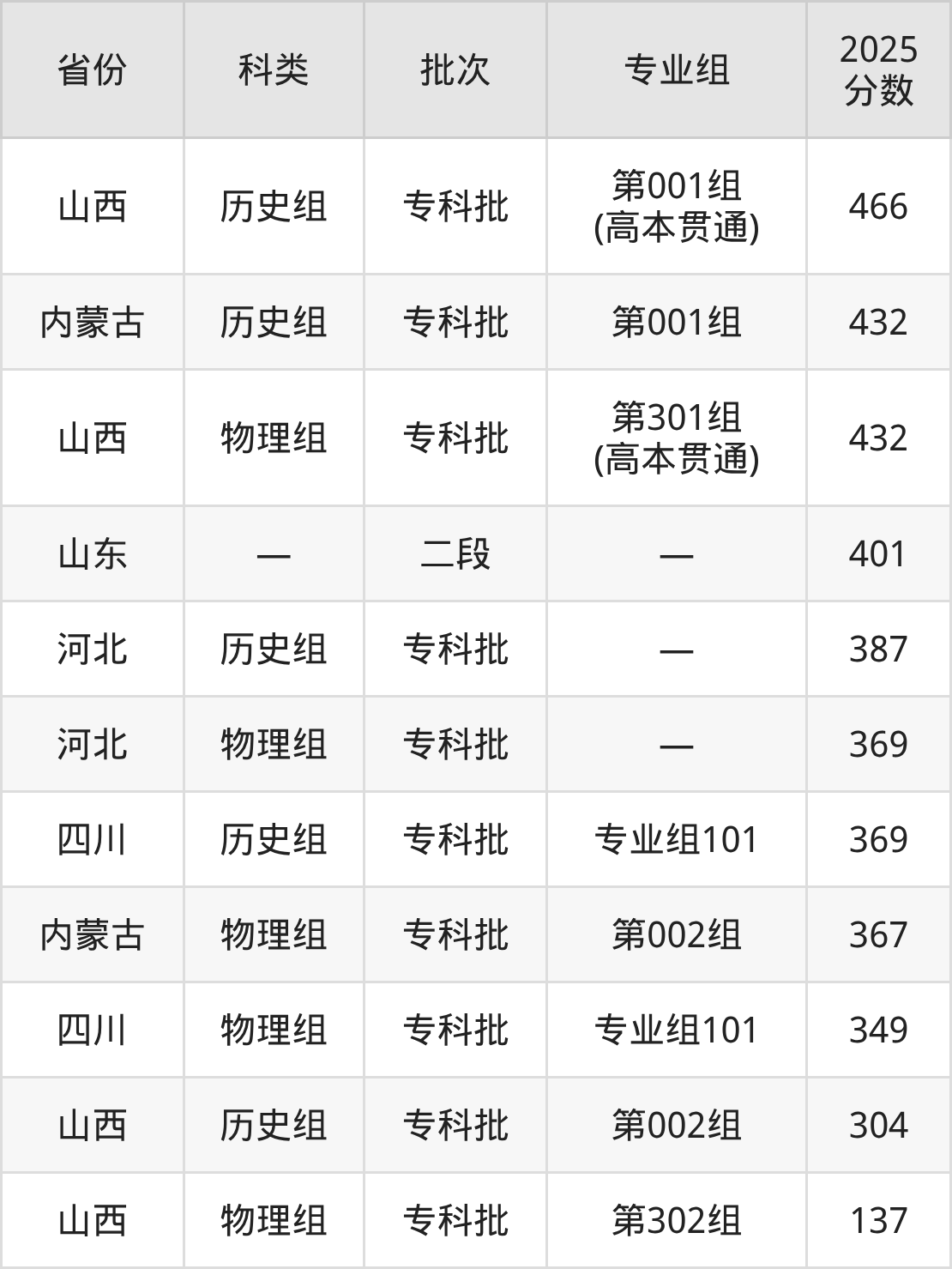 2025年山西金融职业学院在全国普通批次招生的录取分数范围位于137~466分之间,其中省内分数范围为137分~466分,历史组最低分专业组为“第002组”,考生304分即可报考,物理组最低分专业组为“第302组”,考生137分即可报考。
