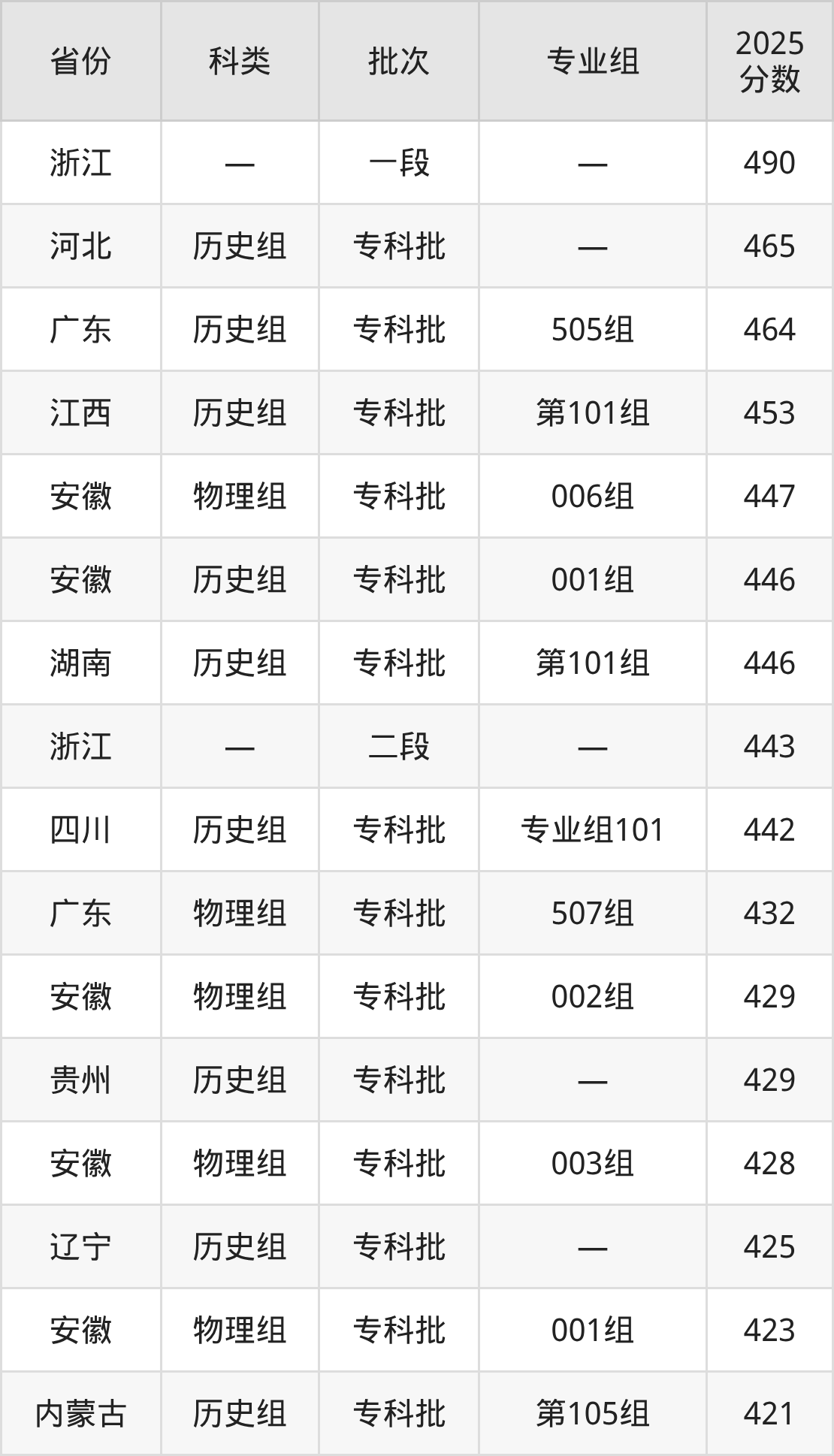 而浙江地区考生的分数门槛最高,2025年江西医学高等专科学校在浙江招生最低分为490分,考生至少要超一段线0分才有可能被录取。