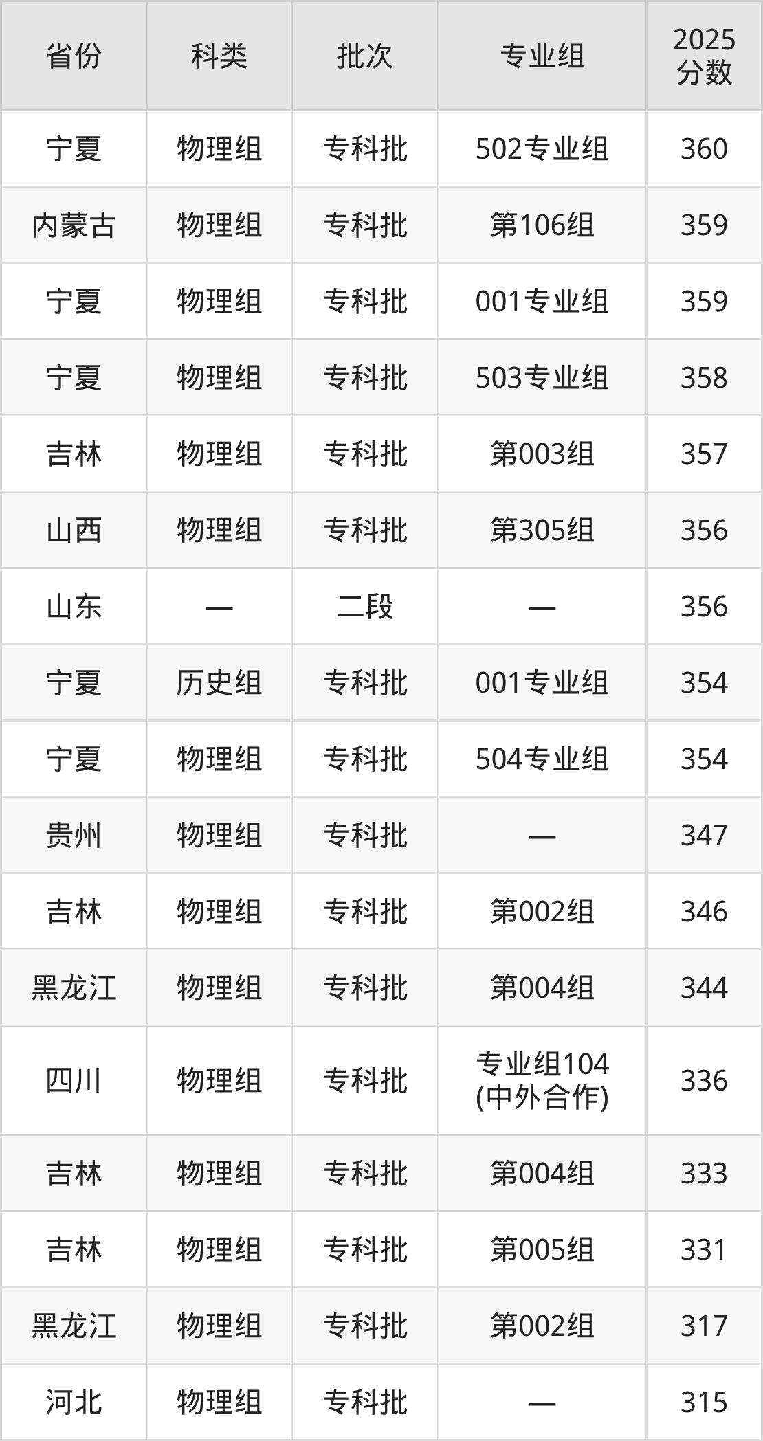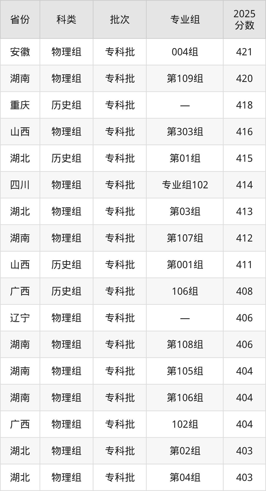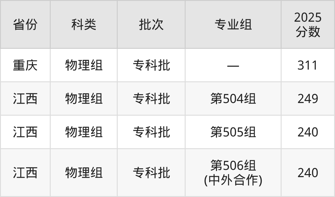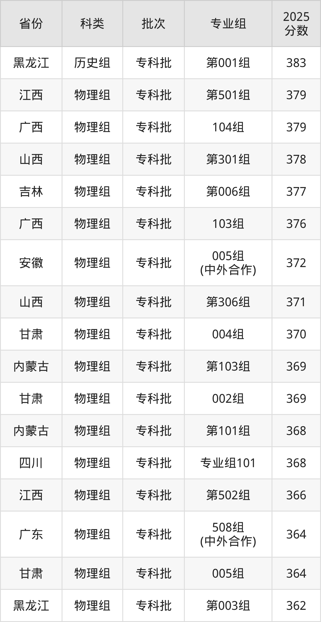 2025年江西医学高等专科学校在全国普通批次招生的录取分数范围位于240~490分之间,其中省内分数范围为240分~453分,历史组最低分专业组为“第101组”,考生453分即可报考,物理组最低分专业组为“第505组”,考生240分即可报考。