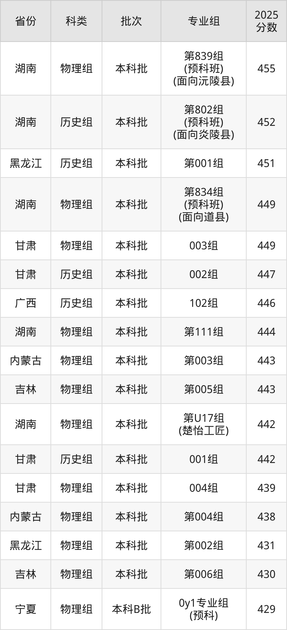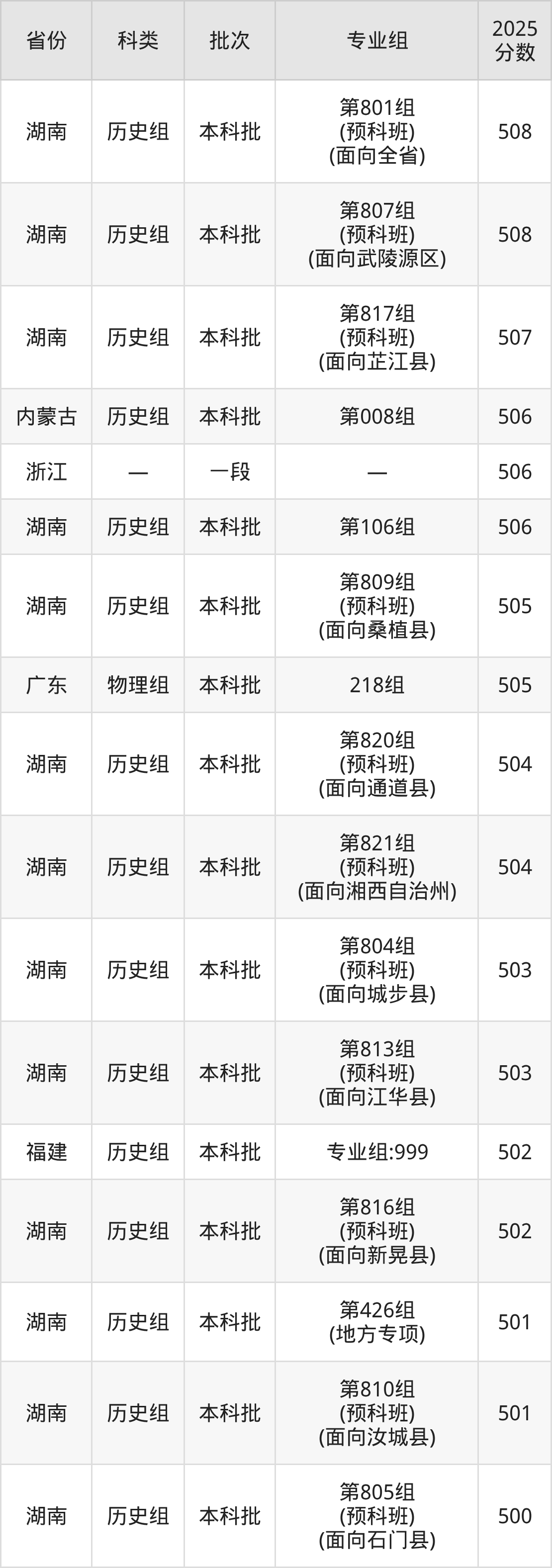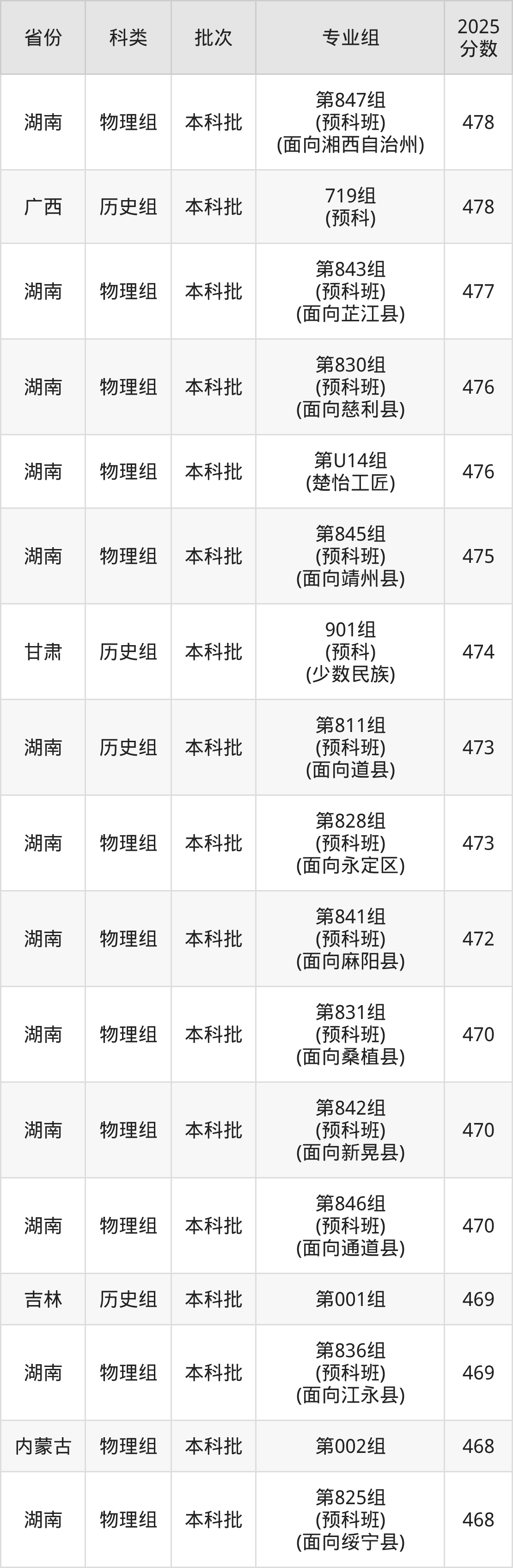 2025年吉首大学在全国普通批次招生的录取分数范围位于427~566分之间,其中省内分数范围为427分~524分,物理组最低分专业组为“第832组(预科班)(面向桃江县)”,考生427分即可报考,历史组最低分专业组为“第802组(预科班)(面向炎陵县)”,考生452分即可报考。