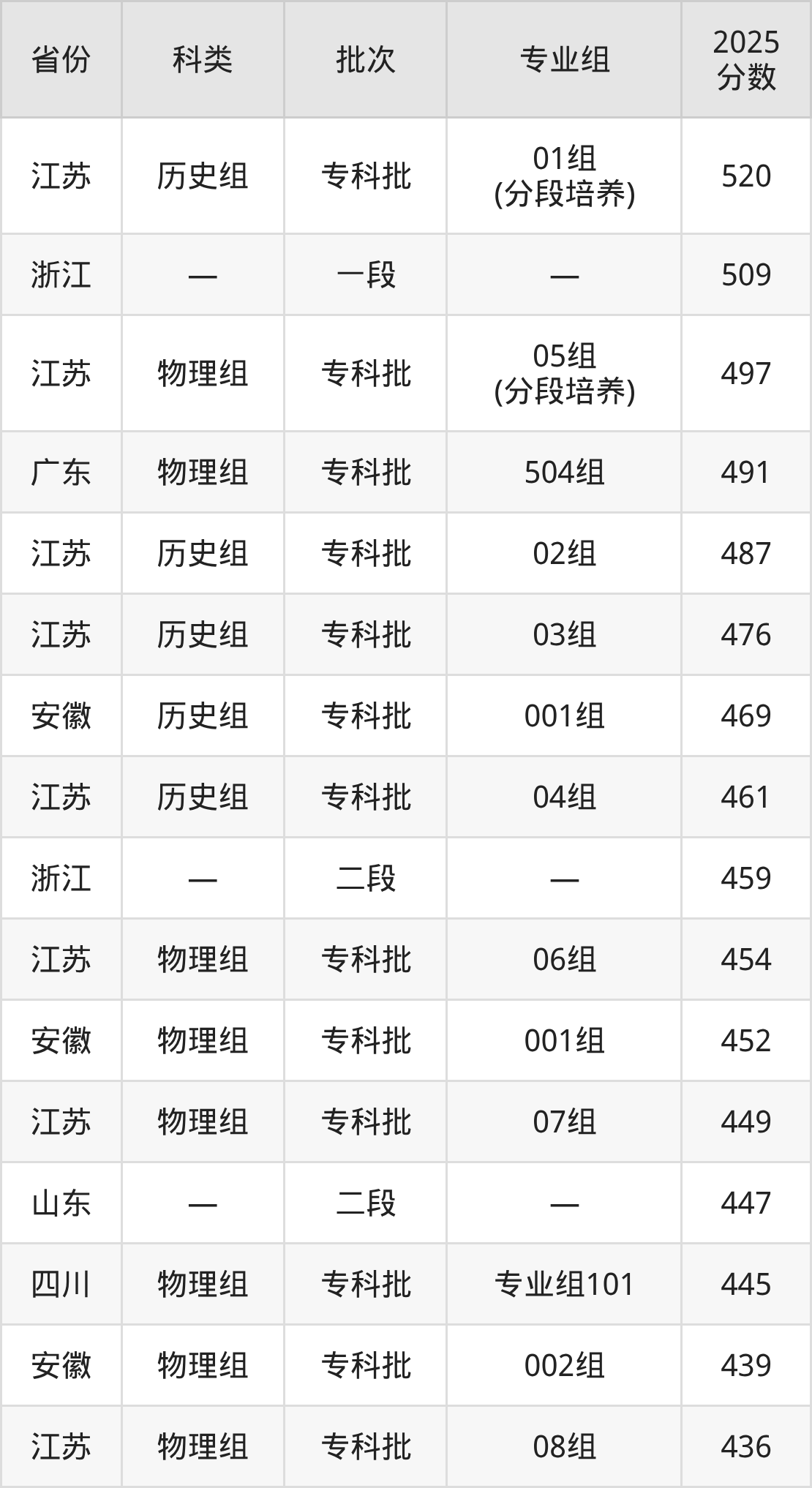 而浙江地区考生的分数门槛最高,2025年江苏卫生健康职业学院在浙江招生最低分为509分,考生至少要超一段线19分才有可能被录取。