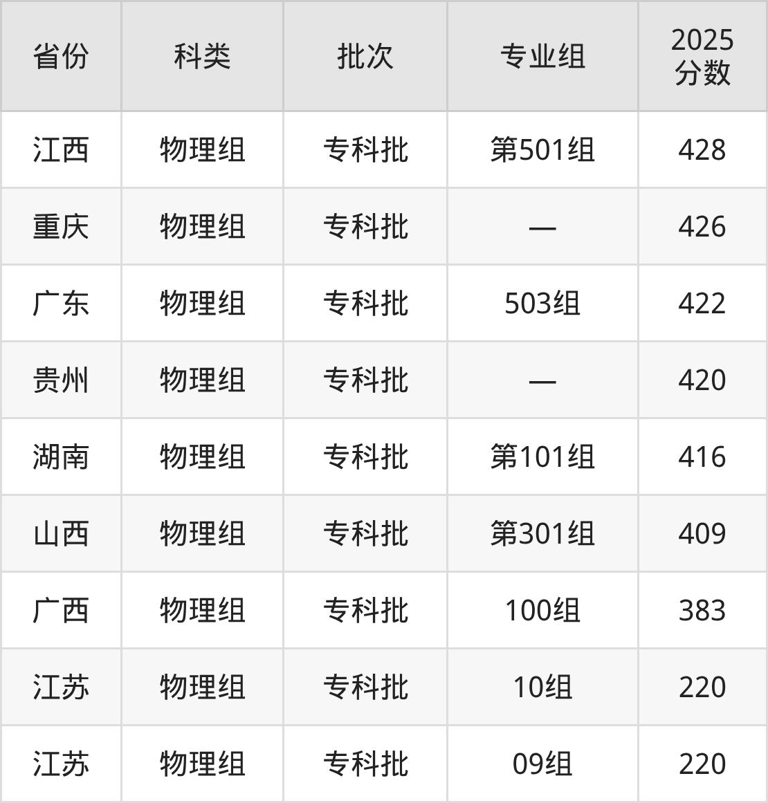 江苏卫生健康职业学院在省外招生的最低分为383分,其中广西地区物理组考生上江苏卫生健康职业学院的分数门槛最低,考生成绩超专科线183分(383分)可上。其次是山西物理组考生,上江苏卫生健康职业学院至少要超专科线309分(409分)。