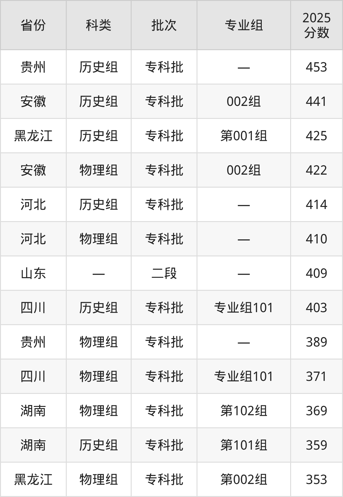 而贵州地区历史组考生的分数门槛最高,2025年安徽城市管理职业学院在贵州招生最低分为453分,考生至少要超专科线273分才有可能被录取。