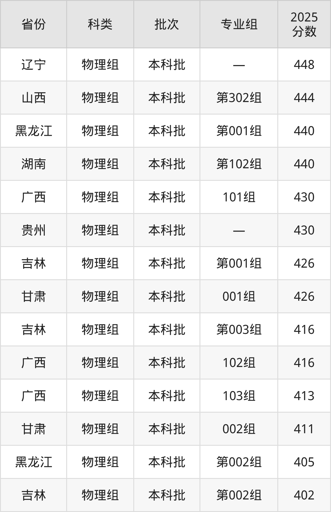 2025年广西中医药大学赛恩斯新医药学院在全国普通批次招生的录取分数范围位于402~553分之间,其中壮族自治区内分数范围为413分~478分,历史组最低分专业组为“104组”,考生478分即可报考,物理组最低分专业组为“103组”,考生413分即可报考。