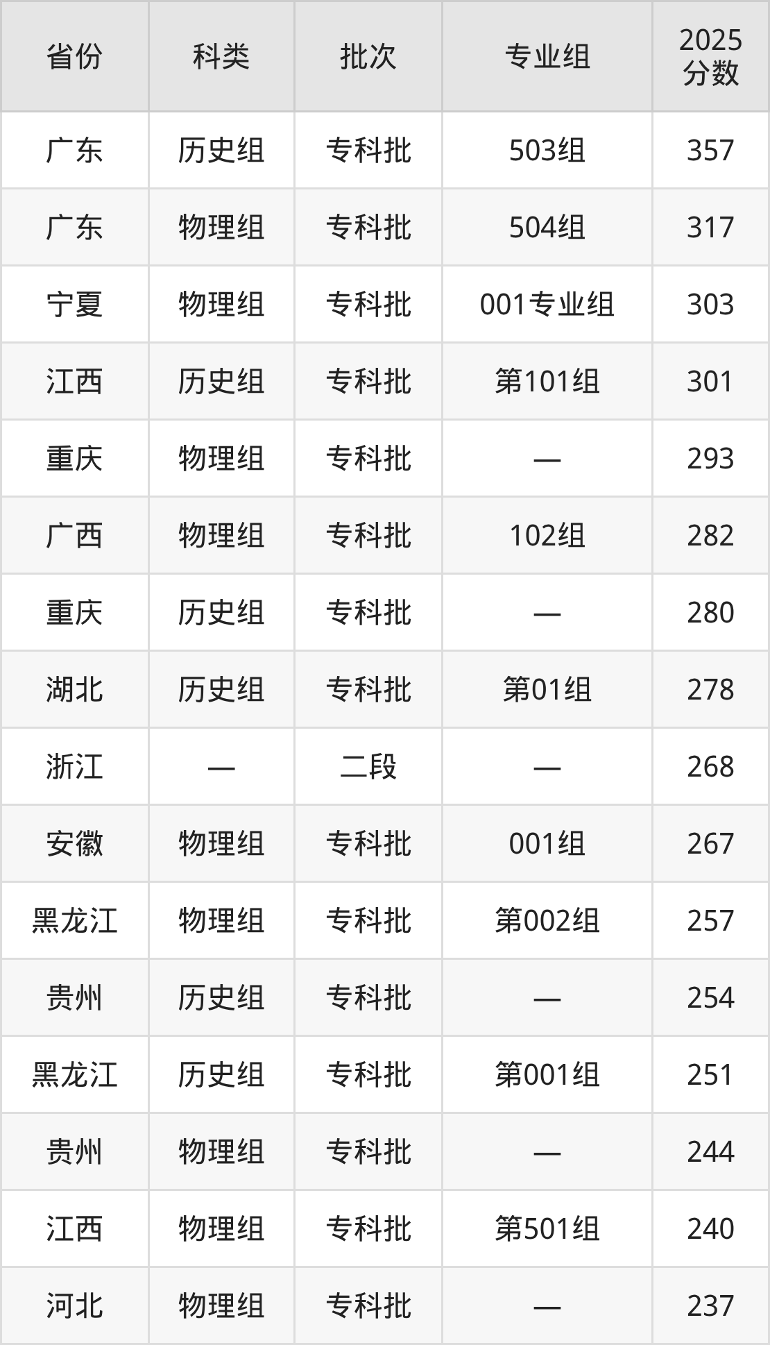 而广东地区历史组考生的分数门槛最高,2025年四川托普信息技术职业学院503组在广东招生最低分为357分,考生至少要超专科线142分才有可能被录取。