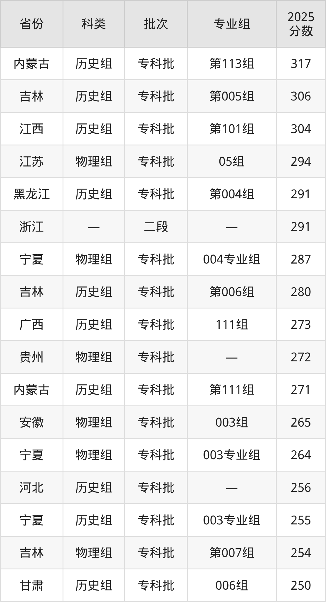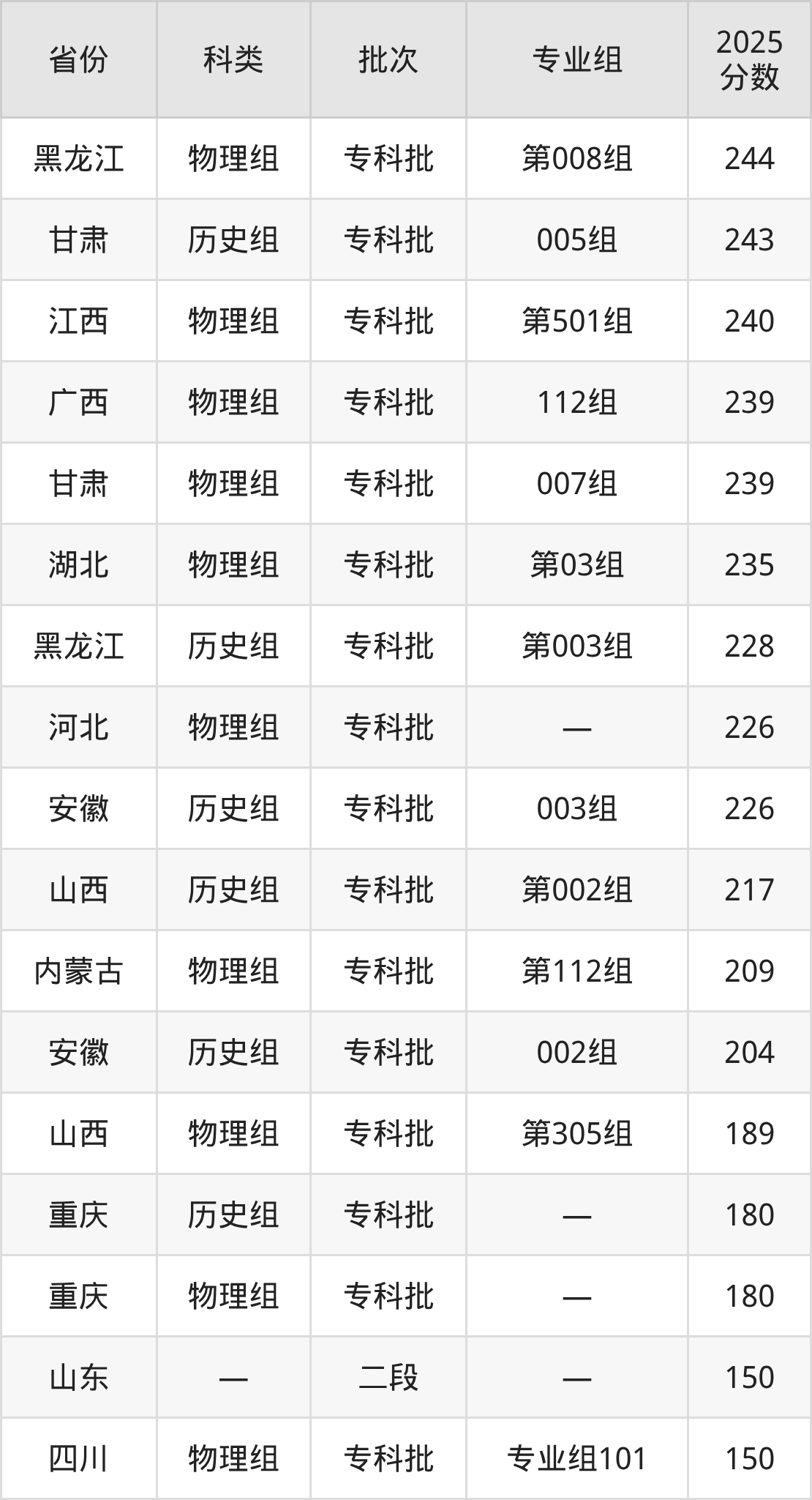 青岛黄海学院在省外招生的最低分为150分,其中四川地区物理组考生上青岛黄海学院的分数门槛最低,考生成绩达专科线即可报考。其次是重庆历史组考生,上青岛黄海学院至少要超专科线0分(180分)。
