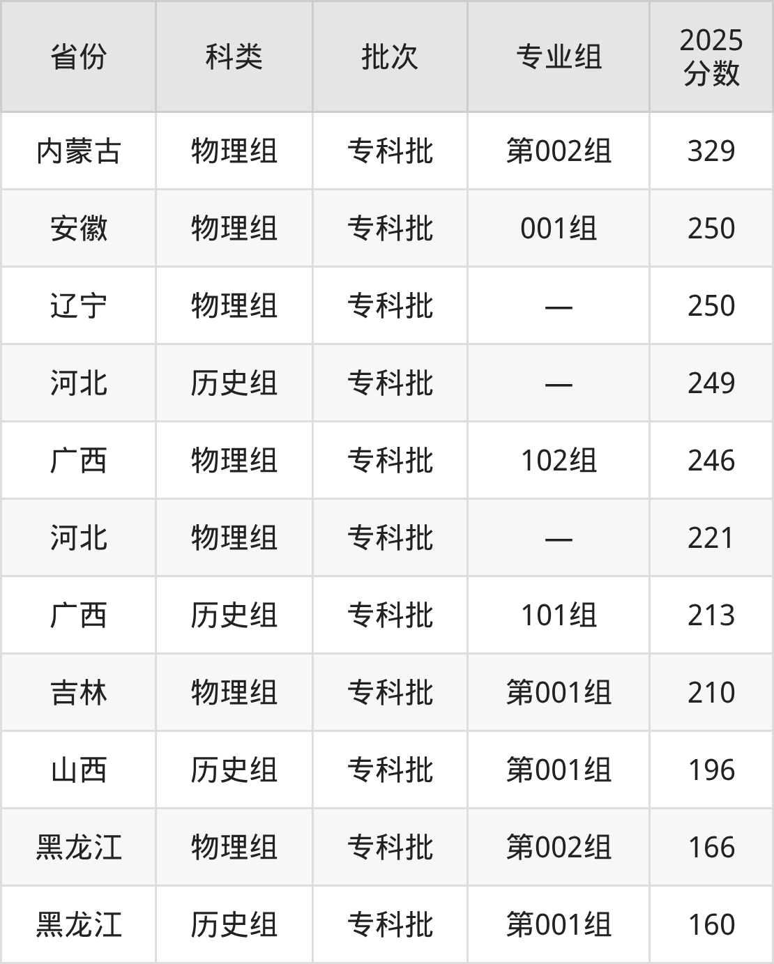 而内蒙古地区物理组考生的分数门槛最高,2025年哈尔滨城市职业学院第002组在内蒙古招生最低分为329分,考生至少要超专科线169分才有可能被录取。