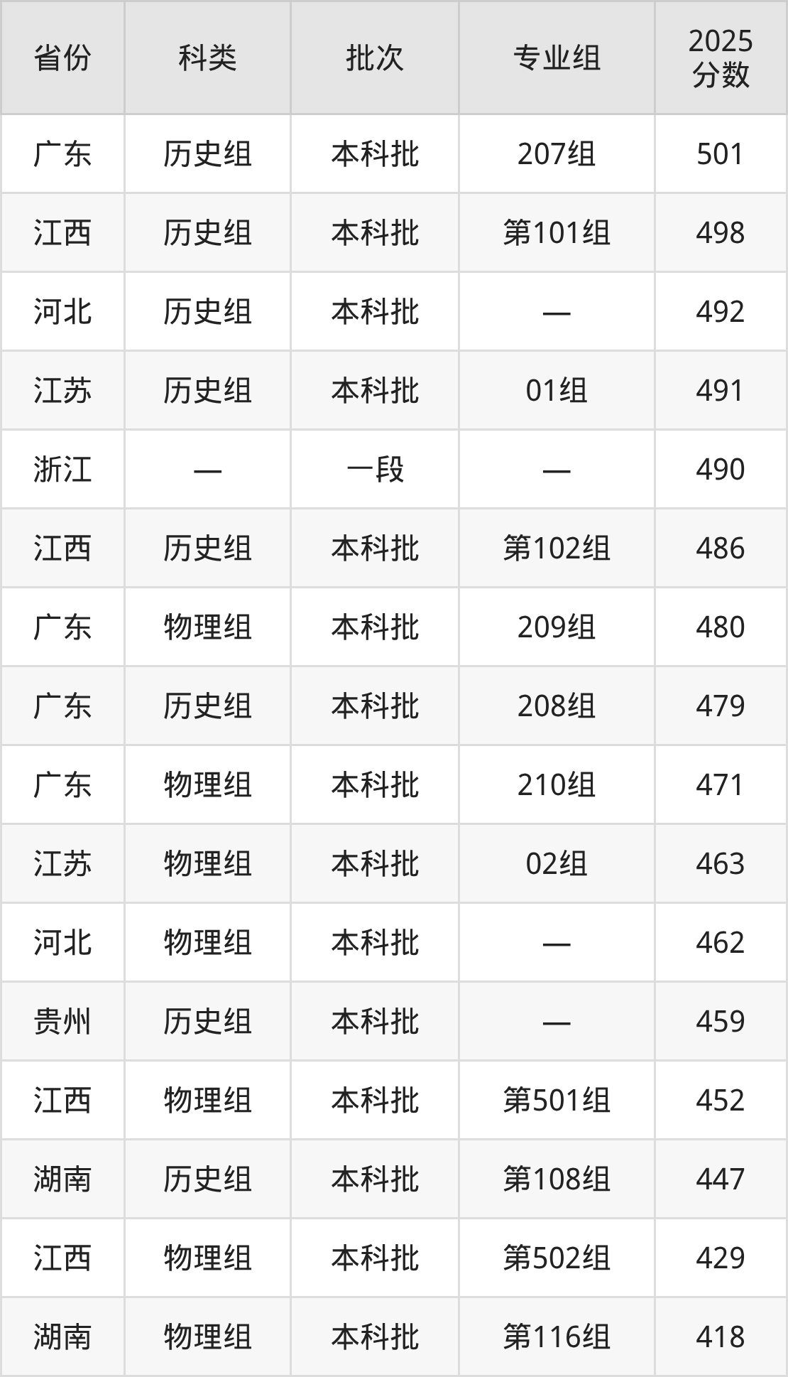 而广东地区历史组考生的分数门槛最高,2025年张家界学院207组在广东招生最低分为501分,考生至少要超本科线37分才有可能被录取。