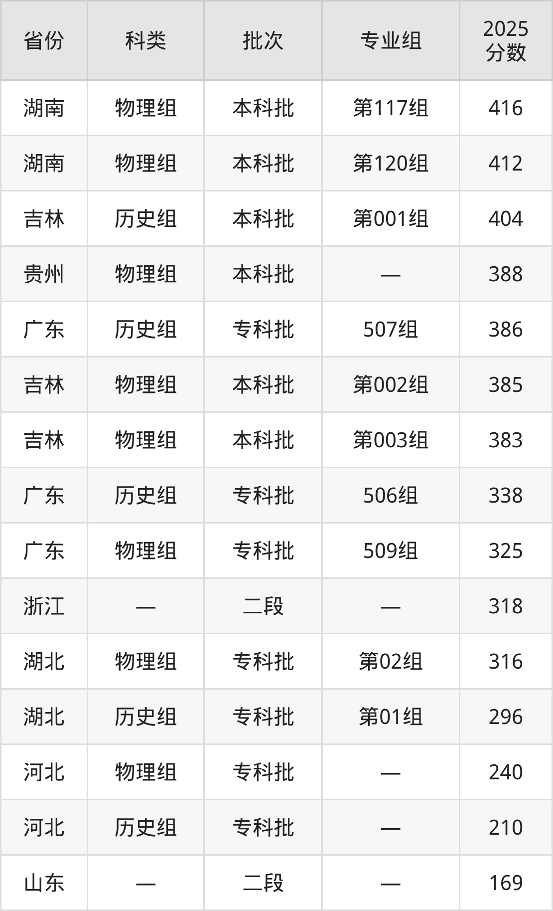 2025年张家界学院在全国普通批次招生的录取分数范围位于169~501分之间,其中省内分数范围为412分~447分,历史组最低分专业组为“第108组”,考生447分即可报考,物理组最低分专业组为“第120组”,考生412分即可报考。