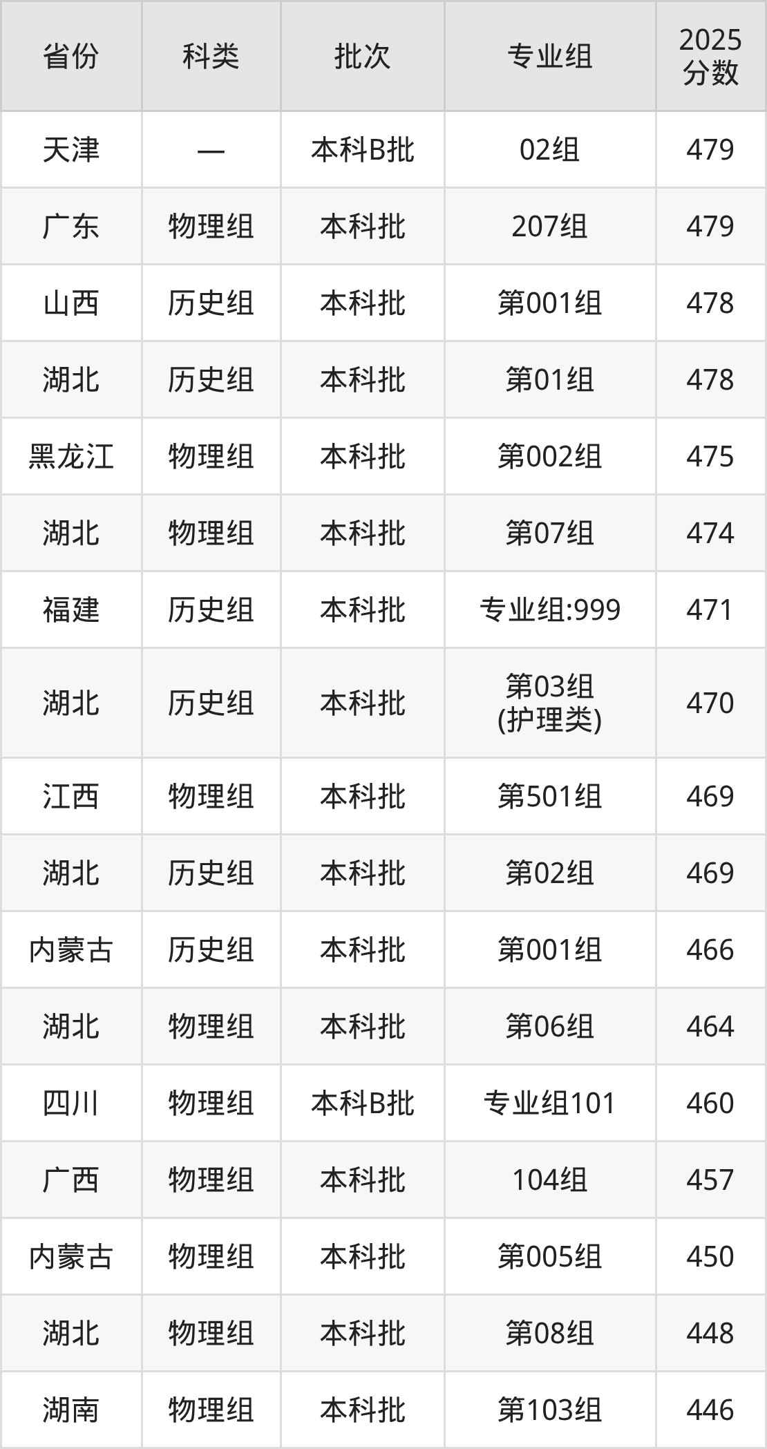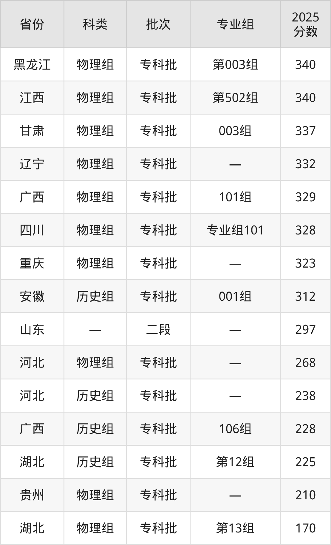 2025年湖北恩施学院在全国普通批次招生的录取分数范围位于170~537分之间,其中省内分数范围为170分~478分,历史组最低分专业组为“第12组”,考生225分即可报考,物理组最低分专业组为“第13组”,考生170分即可报考。