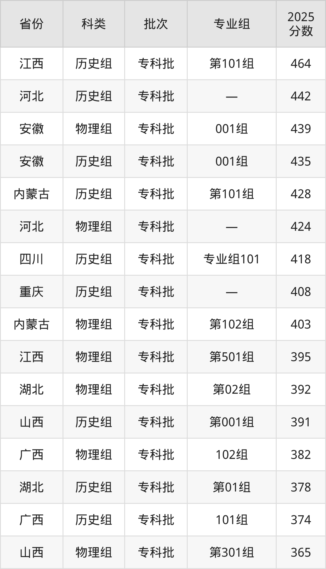 而江西地区历史组考生的分数门槛最高,2025年西安医学高等专科学校第101组在江西招生最低分为464分,考生至少要超专科线174分才有可能被录取。