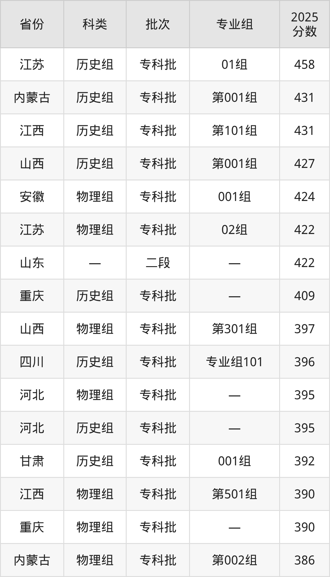 而江苏地区历史组考生的分数门槛最高,2025年陕西财经职业技术学院01组在江苏招生最低分为458分,考生至少要超专科线238分才有可能被录取。