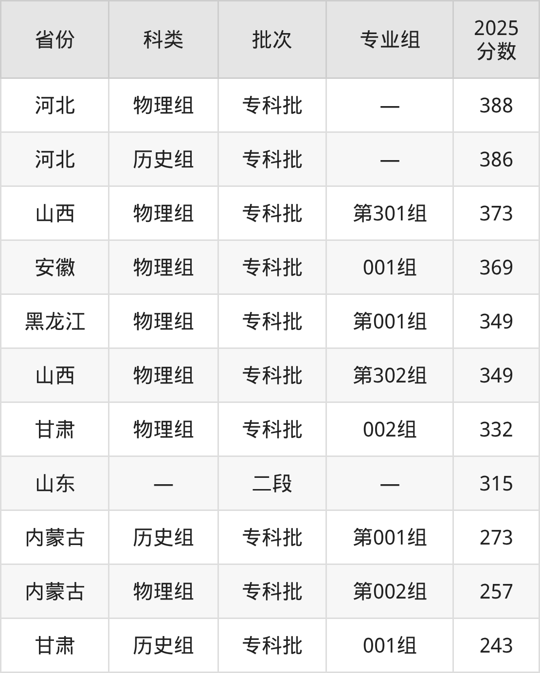 而河北地区物理组考生的分数门槛最高,2025年山东工业职业学院在河北招生最低分为388分,考生至少要超专科线188分才有可能被录取。
