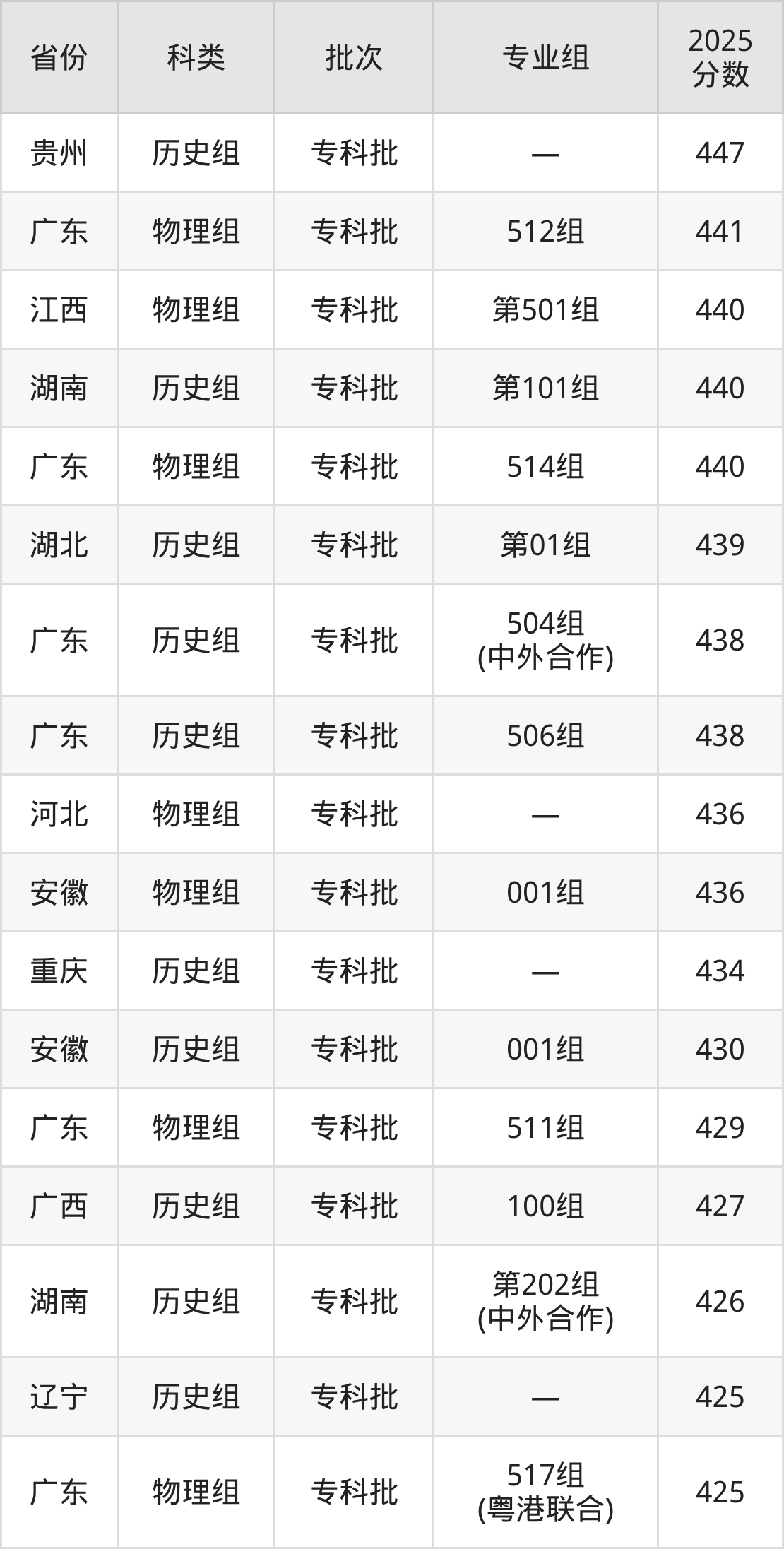 2025年广东科学技术职业学院在全国普通批次招生的录取分数范围位于322~507分之间,其中省内分数范围为383分~507分,历史组最低分专业组为“504组(中外合作)”,考生438分即可报考,物理组最低分专业组为“518组”,考生383分即可报考。