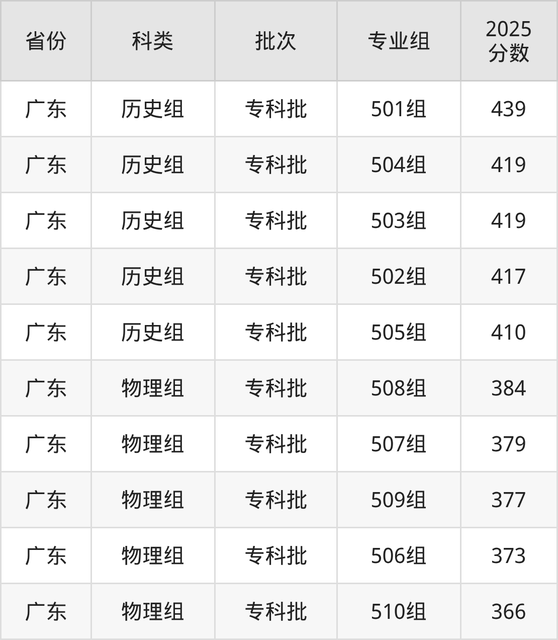2025年广东梅州职业技术学院在全国普通批次招生的录取分数范围位于366~439分之间,其中省内分数范围为366分~439分,历史组最低分专业组为“505组”,考生410分即可报考,物理组最低分专业组为“510组”,考生366分即可报考。