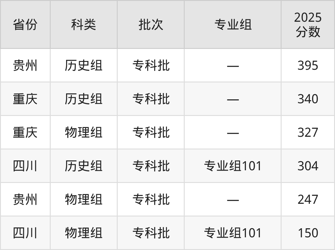 2025年四川三河职业学院在全国普通批次招生的录取分数范围位于150~395分之间,其中省内分数范围为150分~304分,历史组最低分专业组为“专业组101”,考生304分即可报考,物理组最低分专业组为“专业组101”,考生150分即可报考。