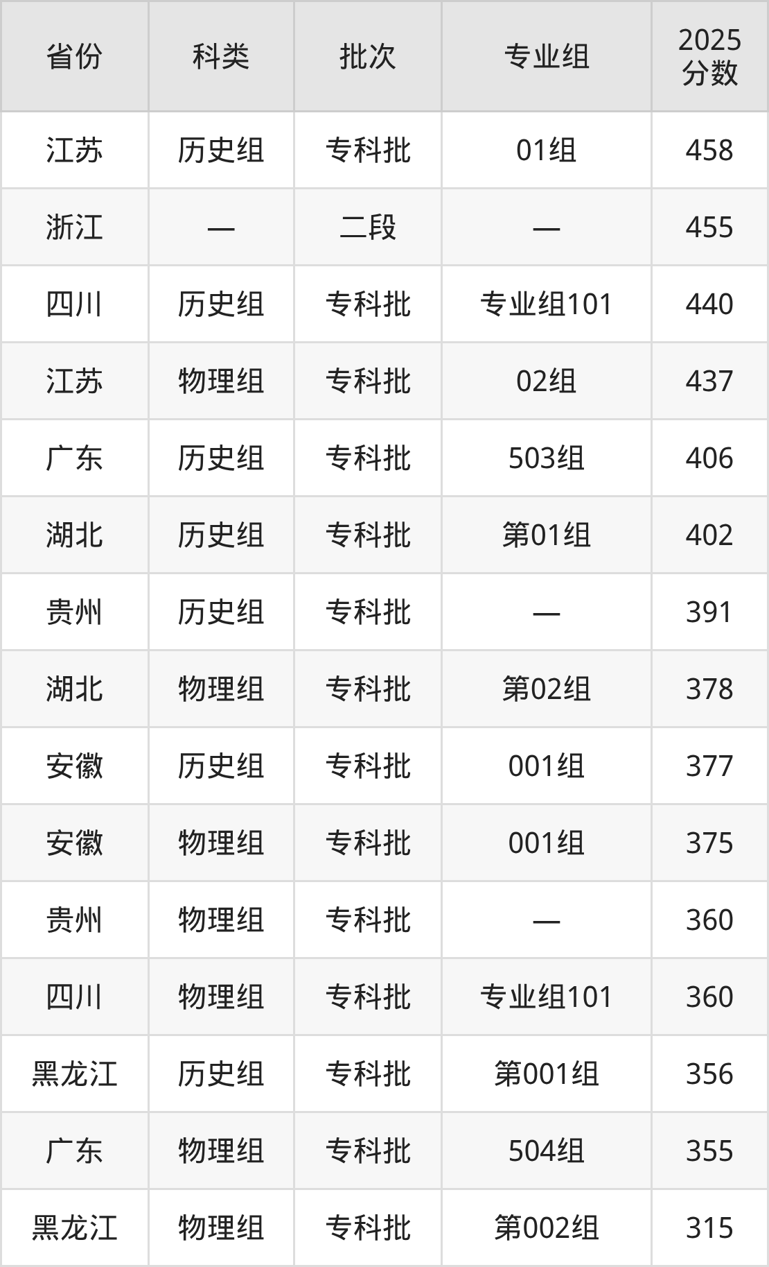 2025年安徽粮食工程职业学院在全国普通批次招生的录取分数范围位于315~458分之间,其中省内分数范围为375分~377分,历史组最低分专业组为“001组”,考生377分即可报考,物理组最低分专业组为“001组”,考生375分即可报考。