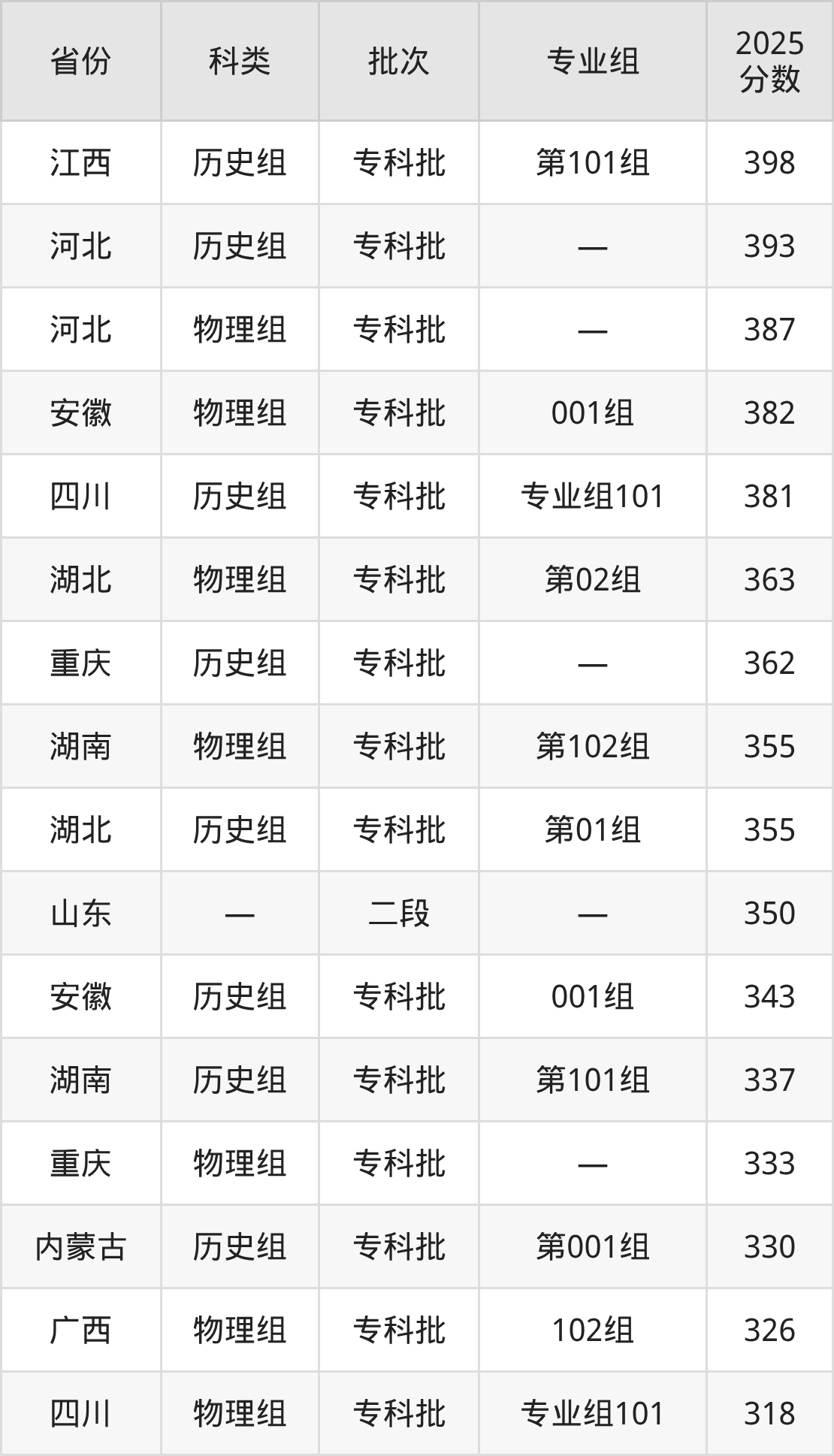 而河北地区历史组考生的分数门槛最高,2025年江西建设职业技术学院在河北招生最低分为393分,考生至少要超专科线193分才有可能被录取。