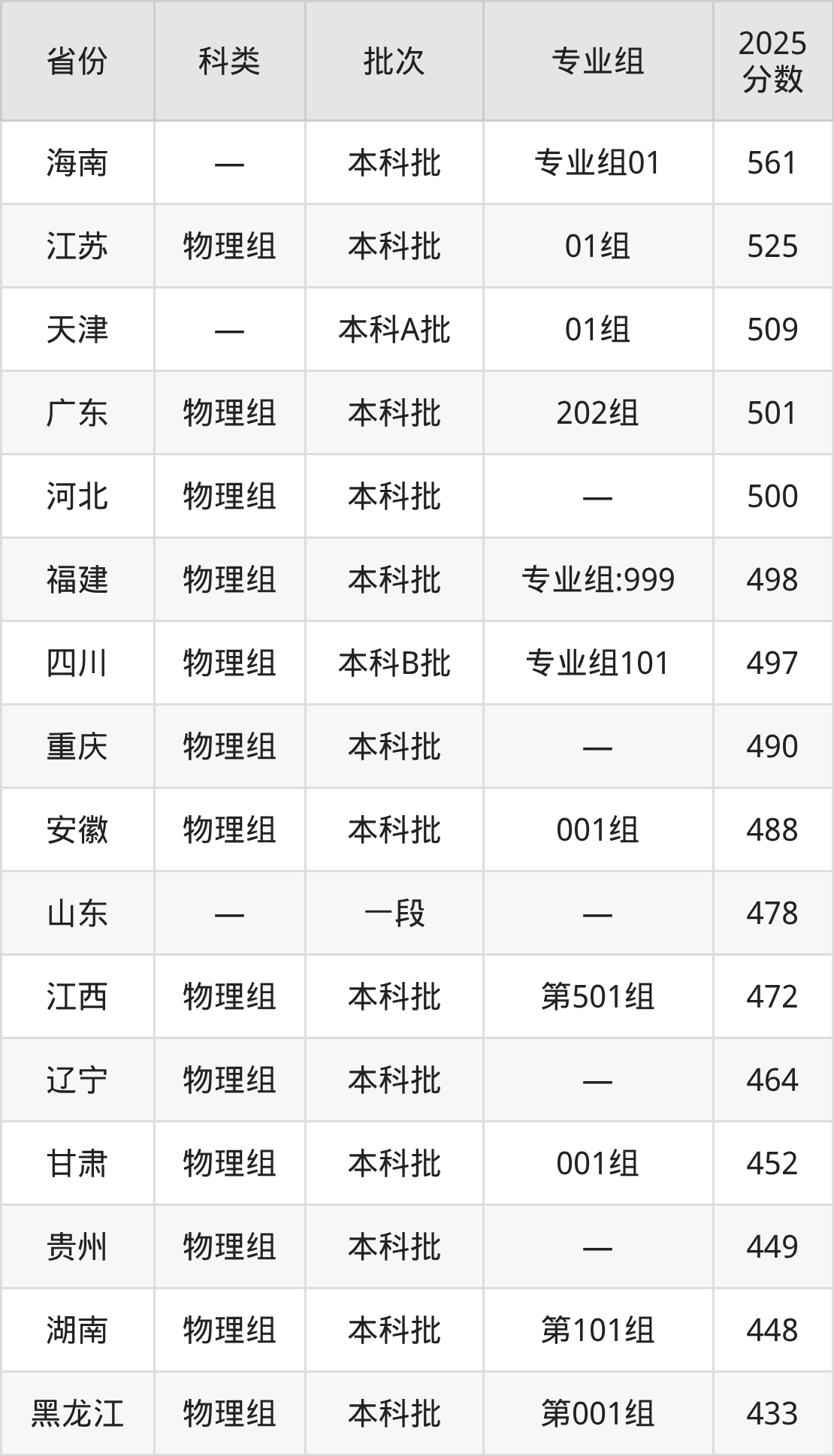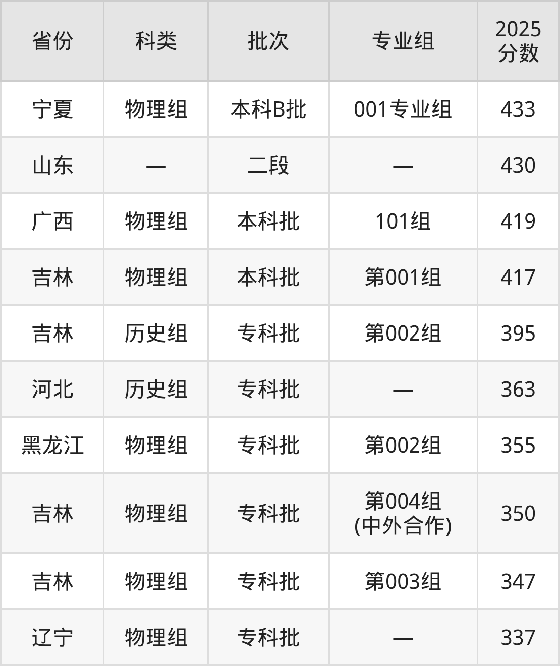 2025年长春汽车职业技术大学在全国普通批次招生的录取分数范围位于337~561分之间,其中省内分数范围为347分~417分,物理组最低分专业组为“第003组”,考生347分即可报考,历史组最低分专业组为“第002组”,考生395分即可报考。