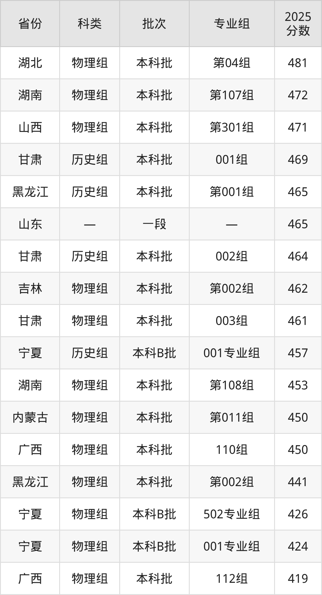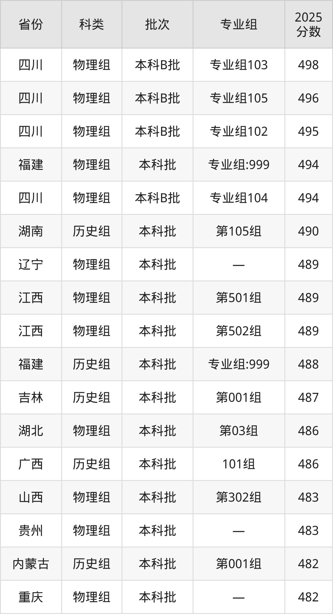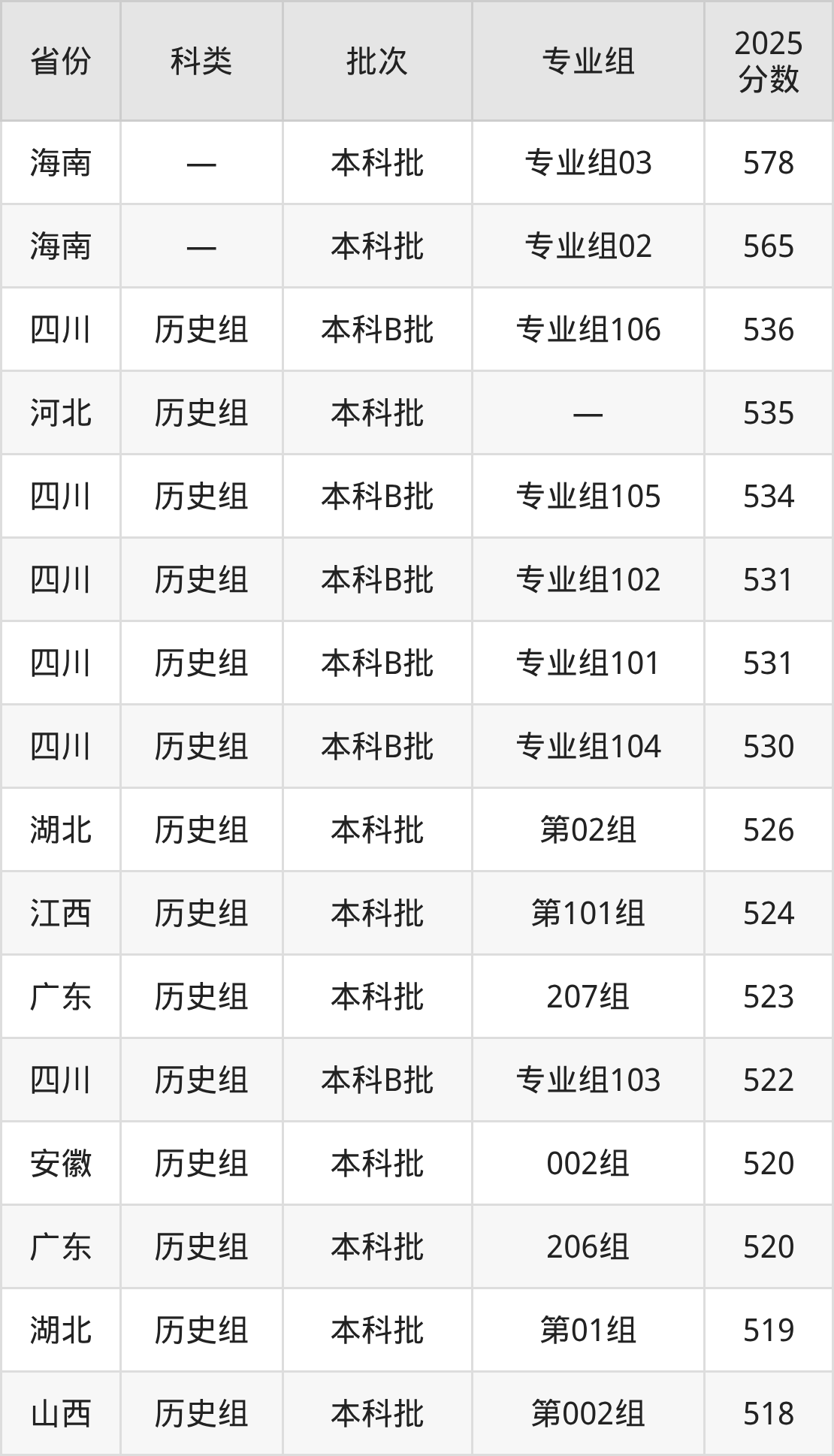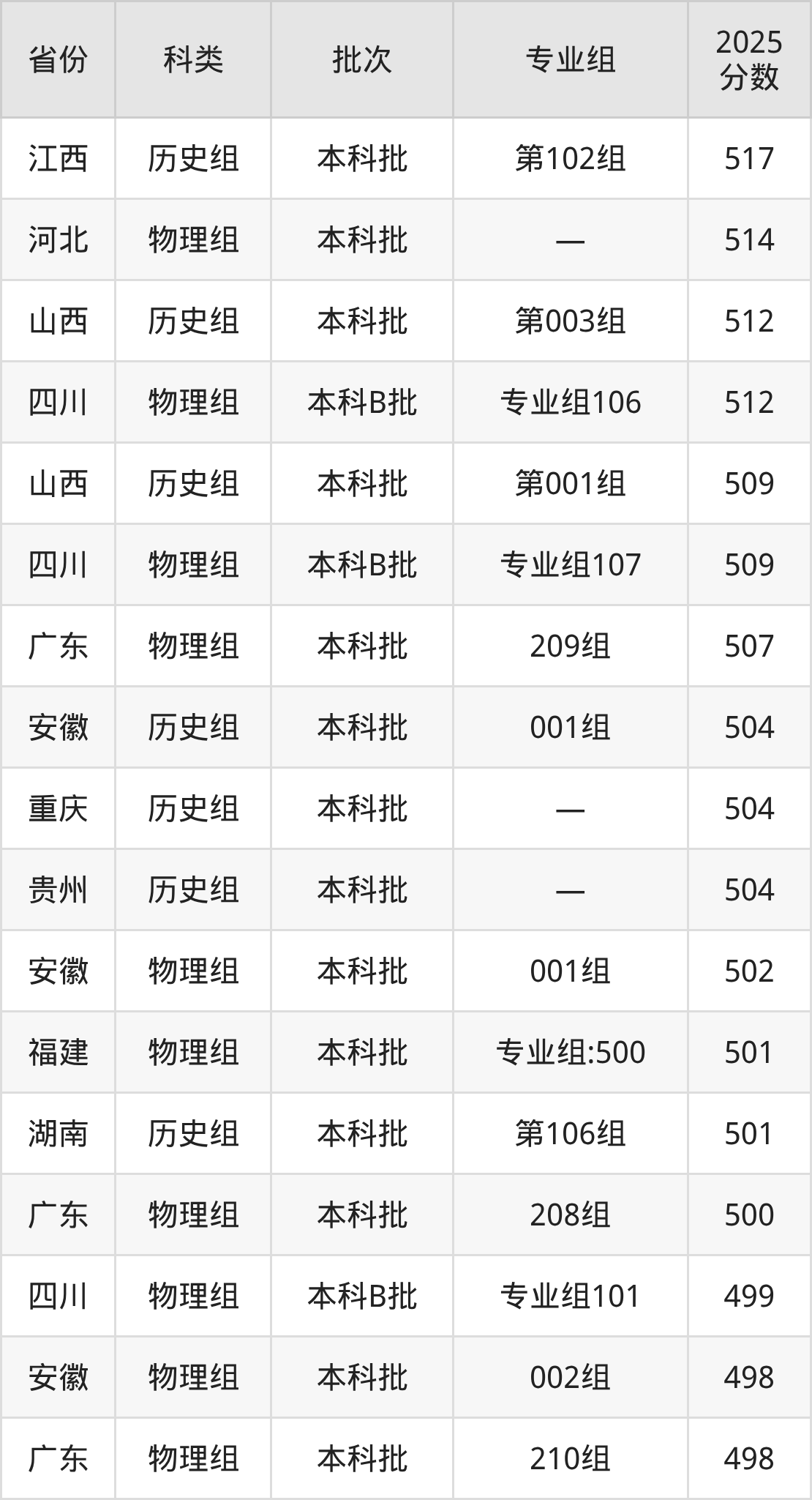 2025年四川文理学院在全国普通批次招生的录取分数范围位于419~578分之间,其中省内分数范围为494分~536分,历史组最低分专业组为“专业组103”,考生522分即可报考,物理组最低分专业组为“专业组104”,考生494分即可报考。