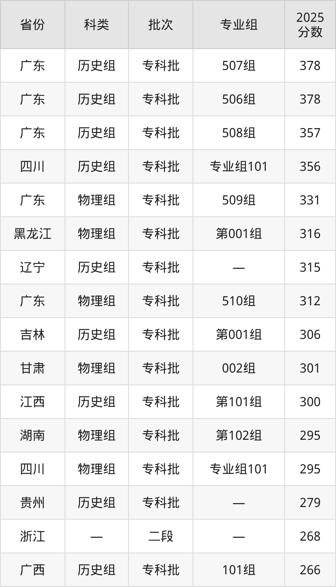 而广东地区历史组考生的分数门槛最高,2025年重庆轻工职业学院507组在广东招生最低分为378分,考生至少要超专科线163分才有可能被录取。