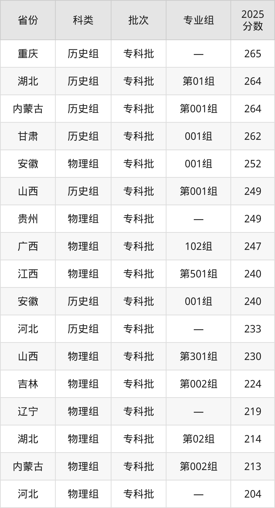 下面是重庆轻工职业学院2025年在全国各省的录取分数线一览表,供参考: