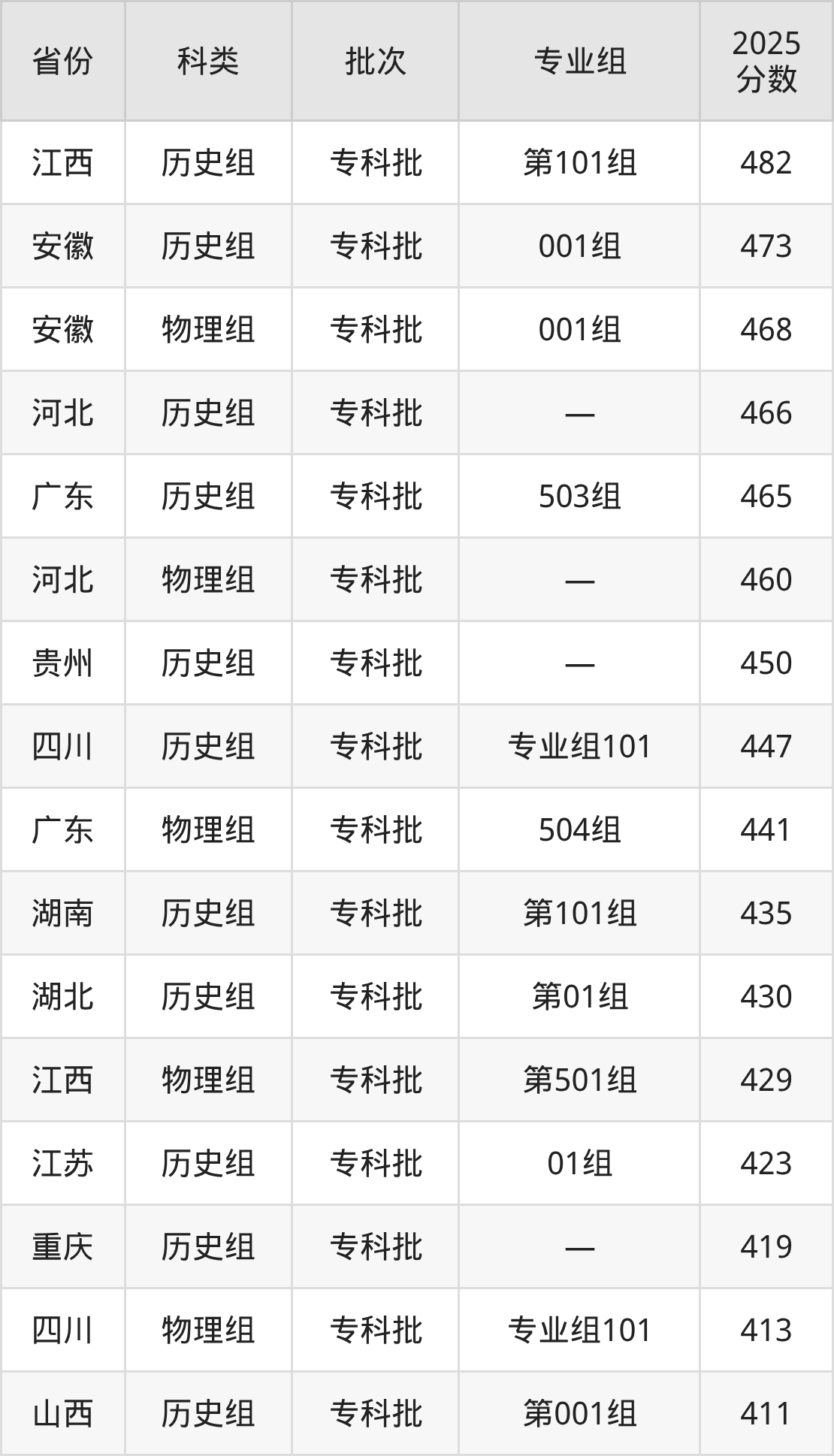 2025年江苏城市职业学院在全国普通批次招生的录取分数范围位于378~482分之间,其中省内分数范围为397分~423分,历史组最低分专业组为“01组”,考生423分即可报考,物理组最低分专业组为“02组”,考生397分即可报考。