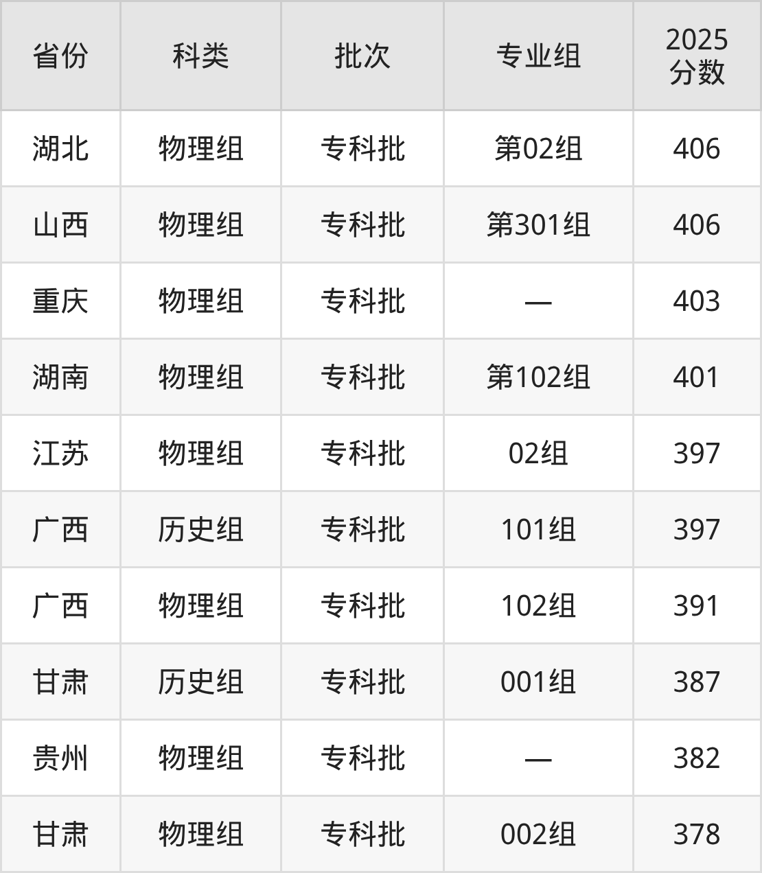 江苏城市职业学院在省外招生的最低分为378分,其中甘肃地区物理组考生上江苏城市职业学院的分数门槛最低,考生成绩超专科线198分(378分)可上。其次是贵州物理组考生,上江苏城市职业学院至少要超专科线202分(382分)。