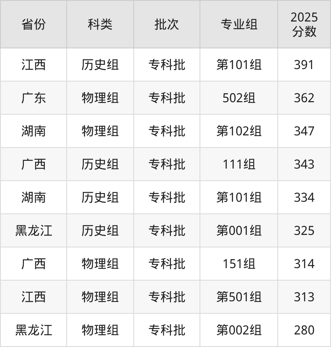 而江西地区历史组考生的分数门槛最高,2025年广西信息职业技术学院第101组在江西招生最低分为391分,考生至少要超专科线101分才有可能被录取。