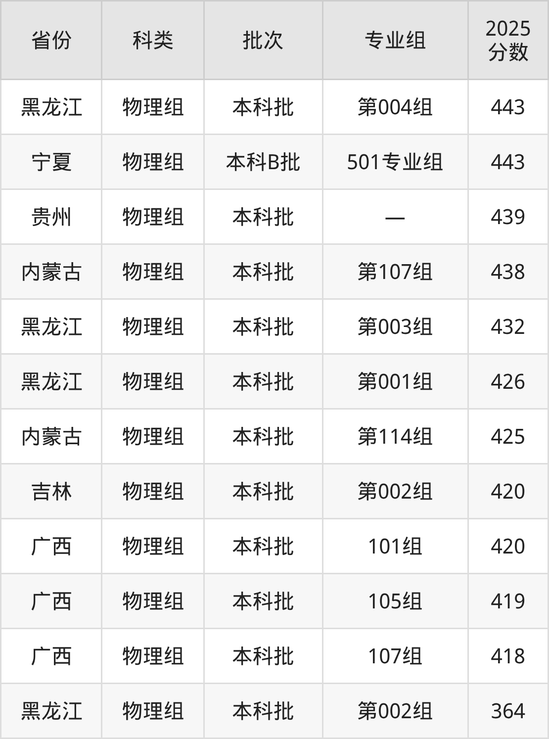2025年内蒙古科技大学在全国普通批次招生的录取分数范围位于364~569分之间,其中自治区内分数范围为425分~529分,历史组最低分专业组为“第103组”,考生505分即可报考,物理组最低分专业组为“第114组”,考生425分即可报考。