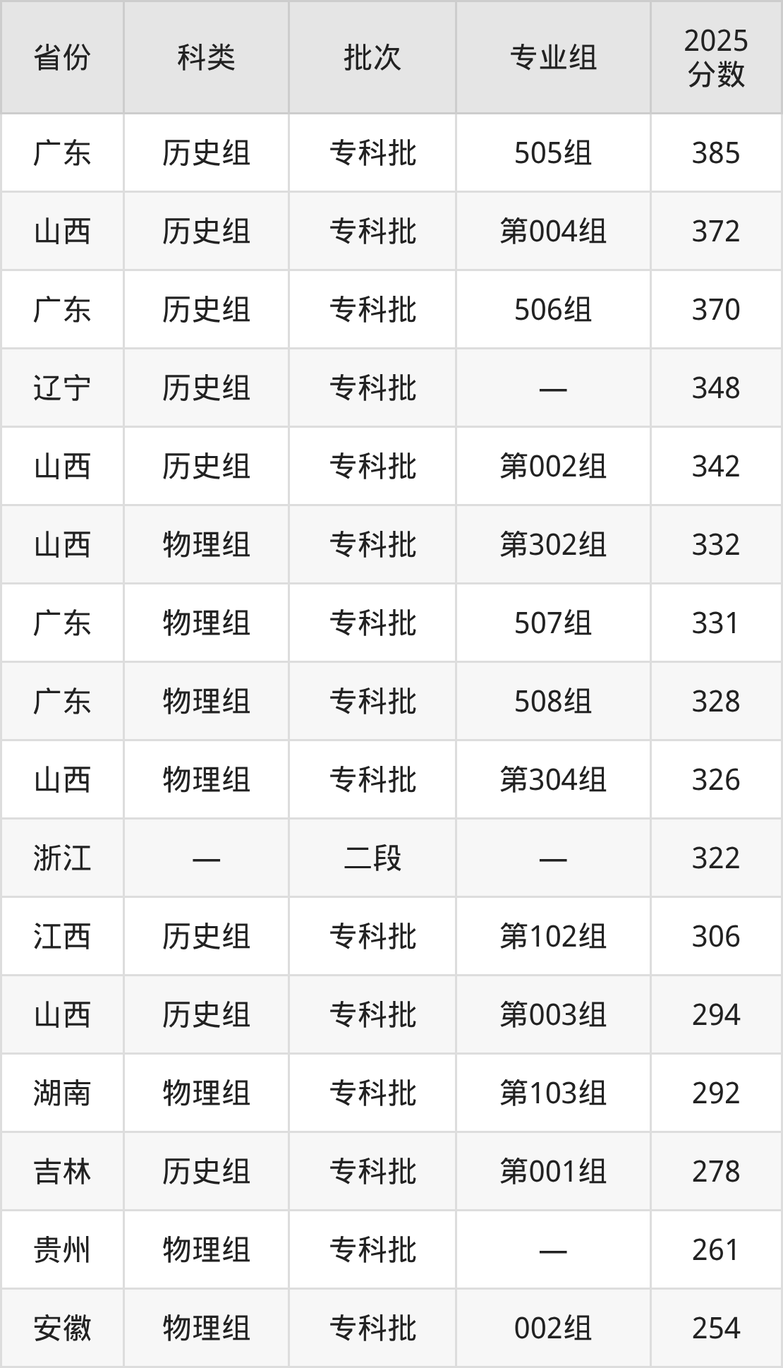 而广东地区历史组考生的分数门槛最高,2025年三亚航空旅游职业学院505组在广东招生最低分为385分,考生至少要超专科线170分才有可能被录取。
