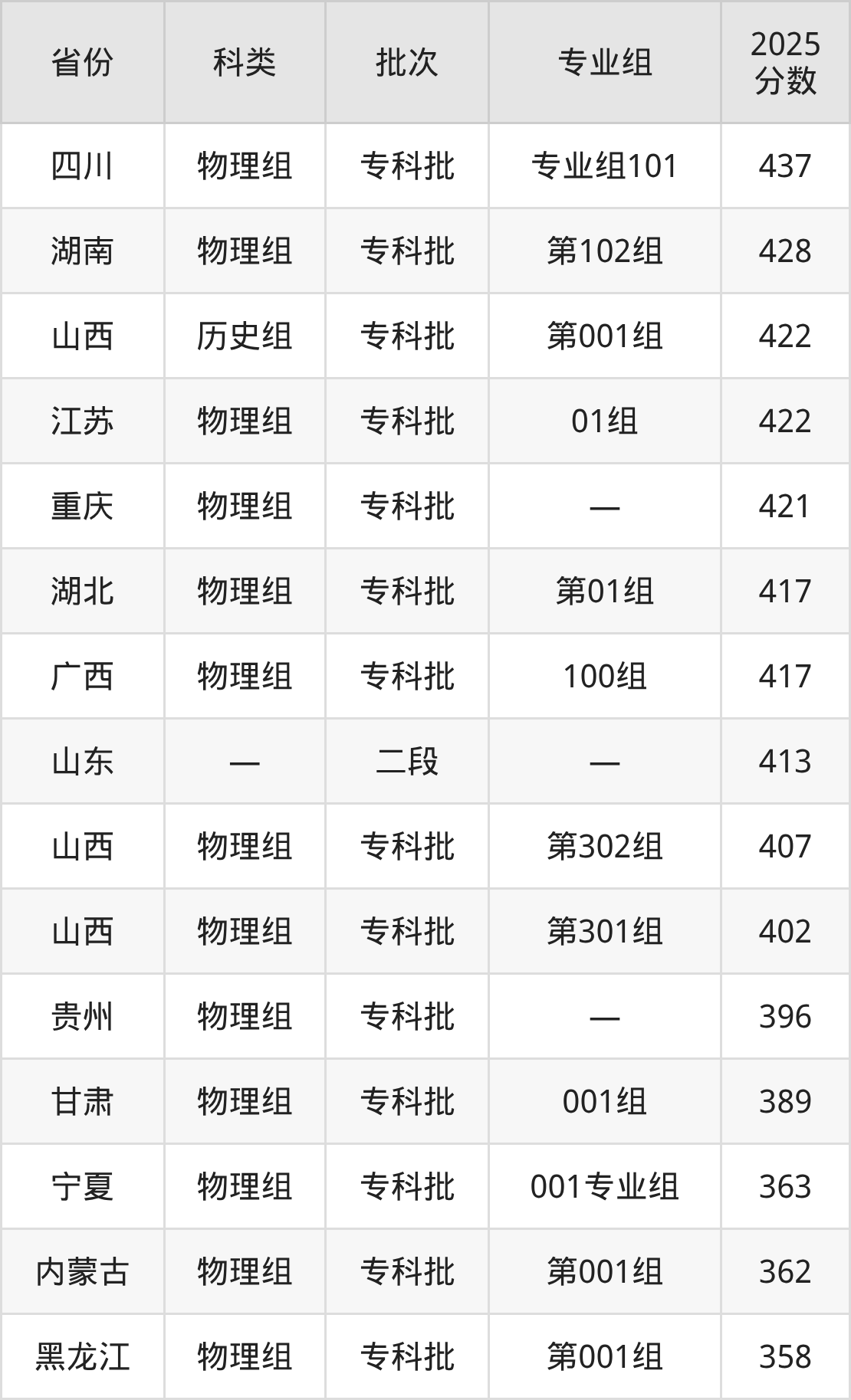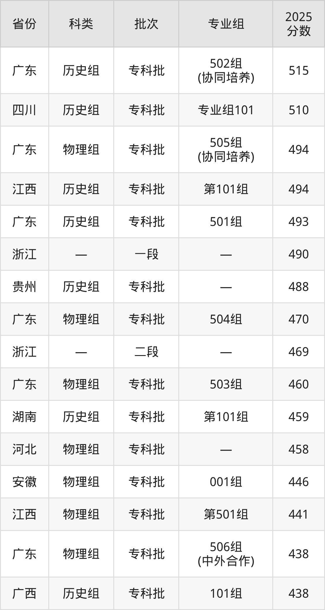 而四川地区历史组考生的分数门槛最高,2025年广州铁路职业技术学院专业组101在四川招生最低分为510分,考生至少要超专科线360分才有可能被录取。