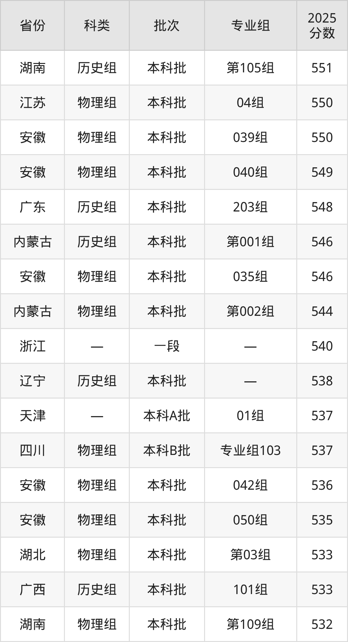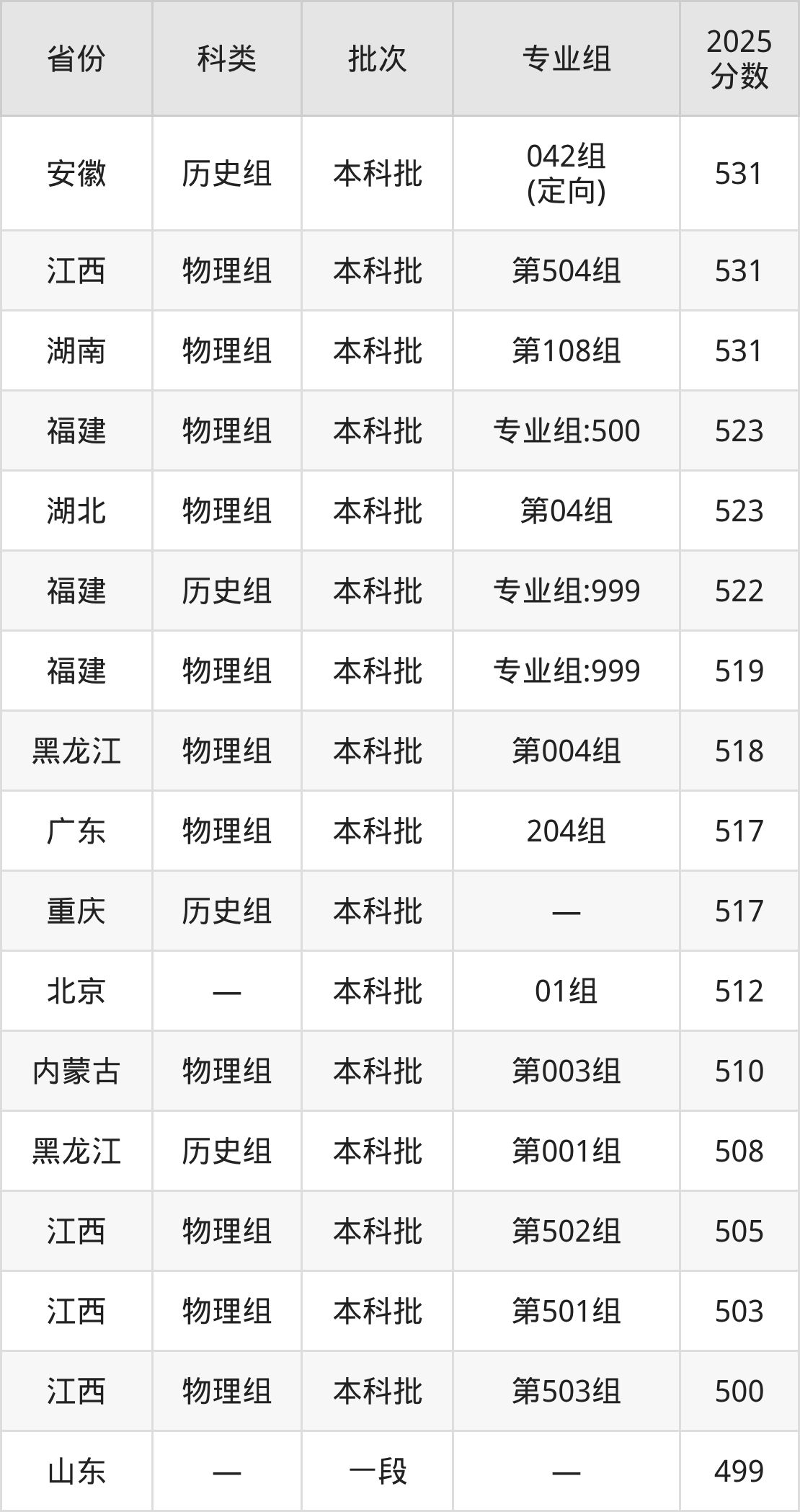 2025年安徽师范大学在全国普通批次招生的录取分数范围位于398~589分之间,其中省内分数范围为531分~586分,物理组最低分专业组为“050组”,考生535分即可报考,历史组最低分专业组为“042组(定向)”,考生531分即可报考。
