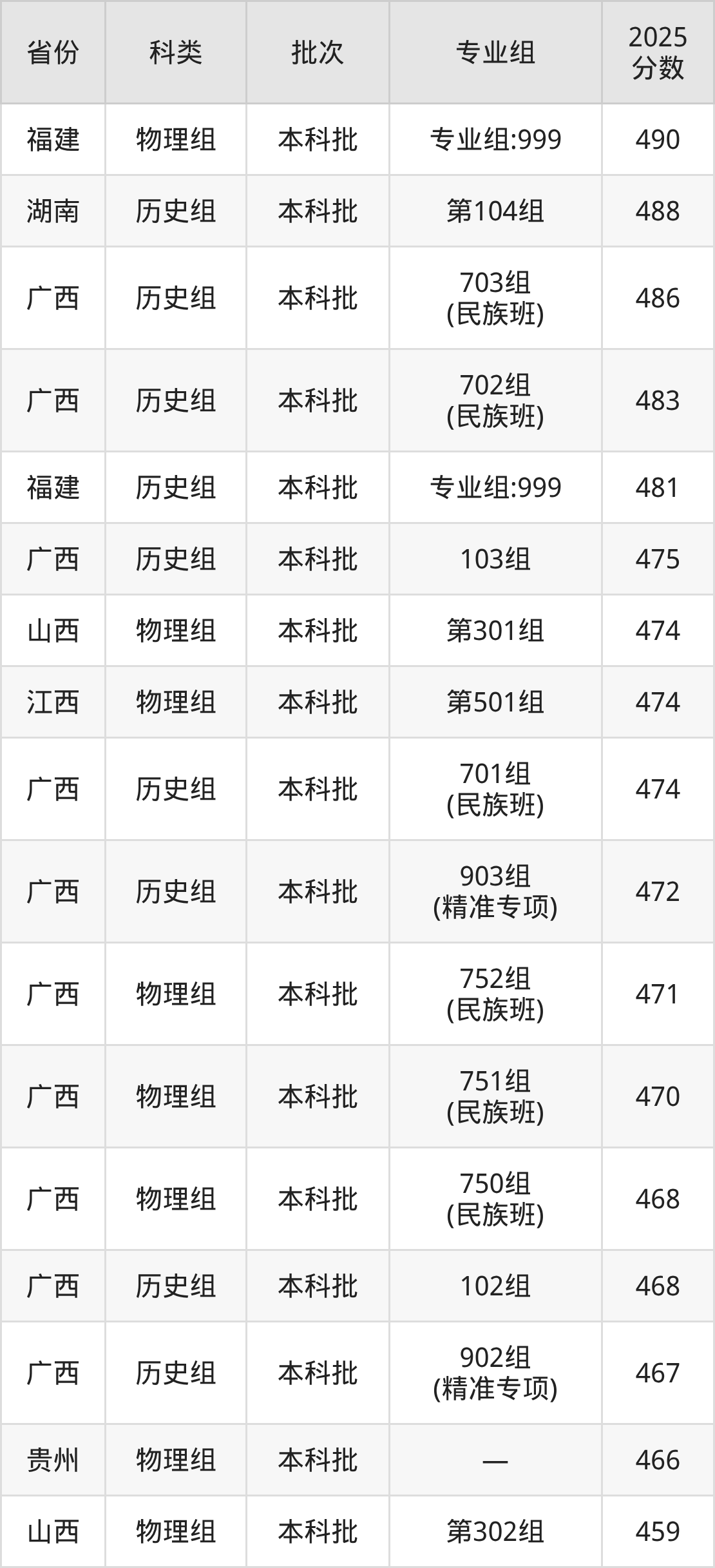 下面是广西民族师范学院2025年在全国各省的录取分数线一览表,供参考: