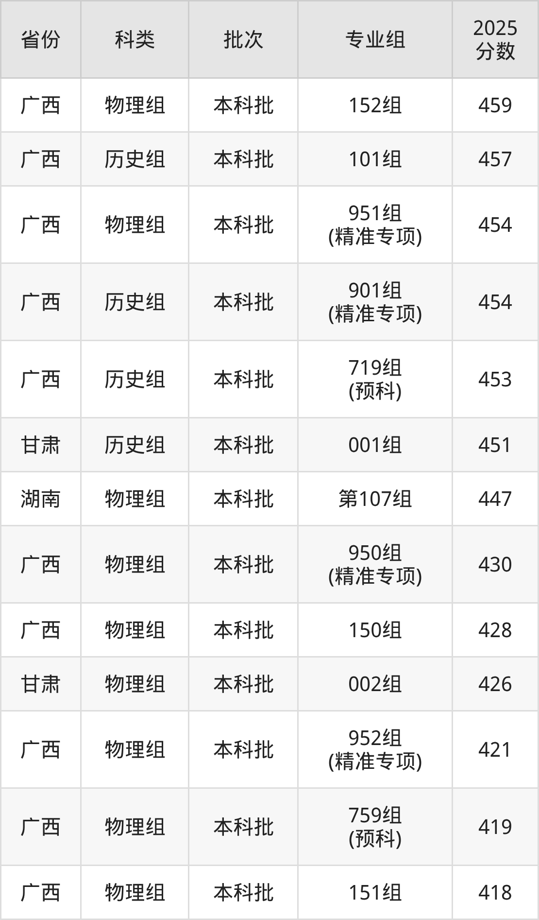 2025年广西民族师范学院在全国普通批次招生的录取分数范围位于418~590分之间,其中壮族自治区内分数范围为418分~486分,历史组最低分专业组为“719组(预科)”,考生453分即可报考,物理组最低分专业组为“151组”,考生418分即可报考。