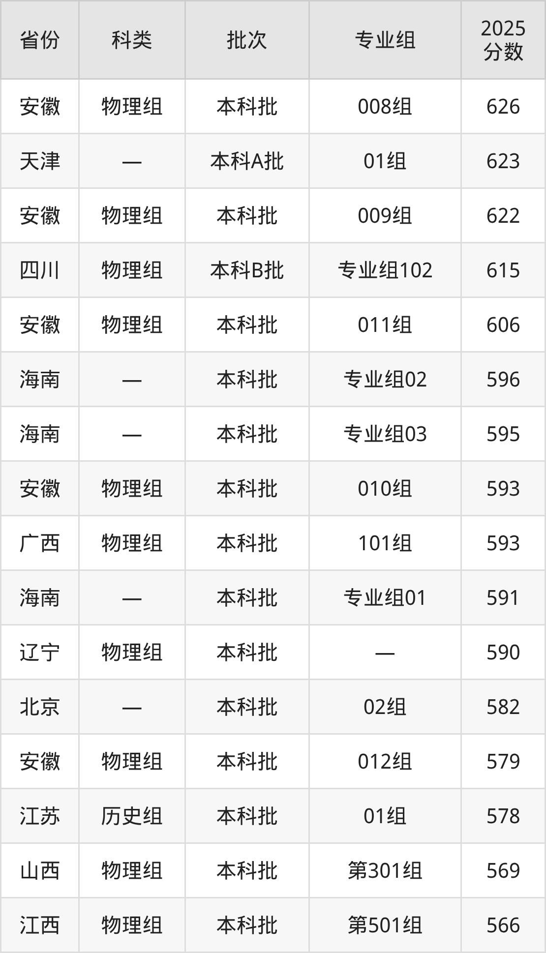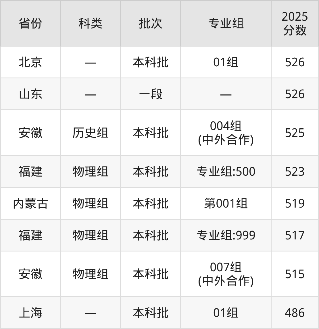 2025年安徽医科大学在全国普通批次招生的录取分数范围位于486~626分之间,其中省内分数范围为515分~626分,物理组最低分专业组为“007组(中外合作)”,考生515分即可报考,历史组最低分专业组为“004组(中外合作)”,考生525分即可报考。