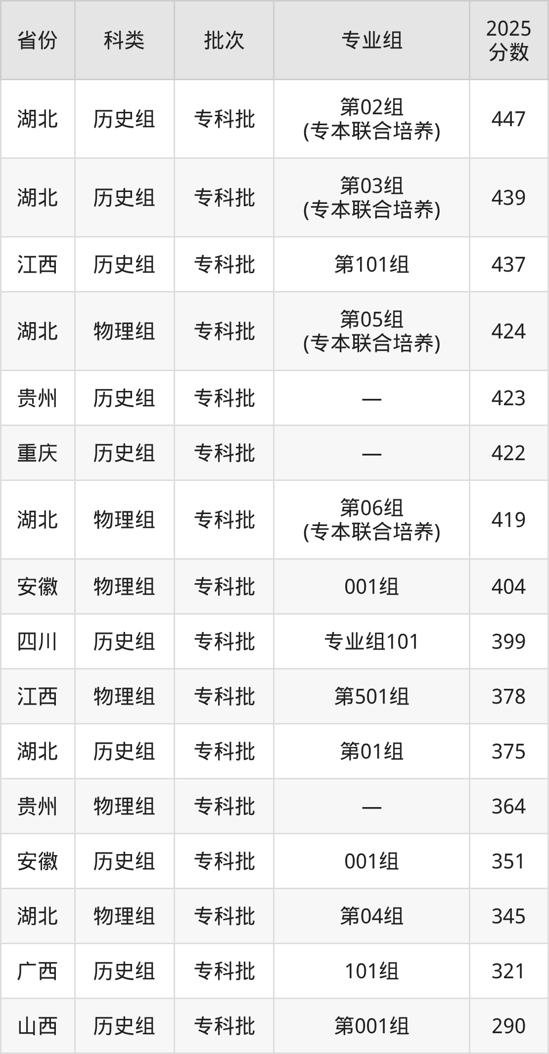 而江西地区历史组考生的分数门槛最高,2025年湖北幼儿师范高等专科学校第101组在江西招生最低分为437分,考生至少要超专科线147分才有可能被录取。