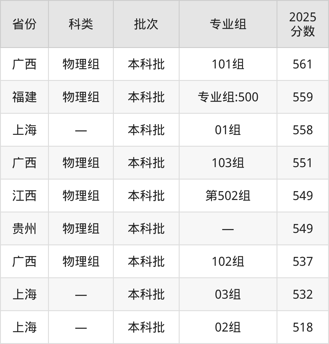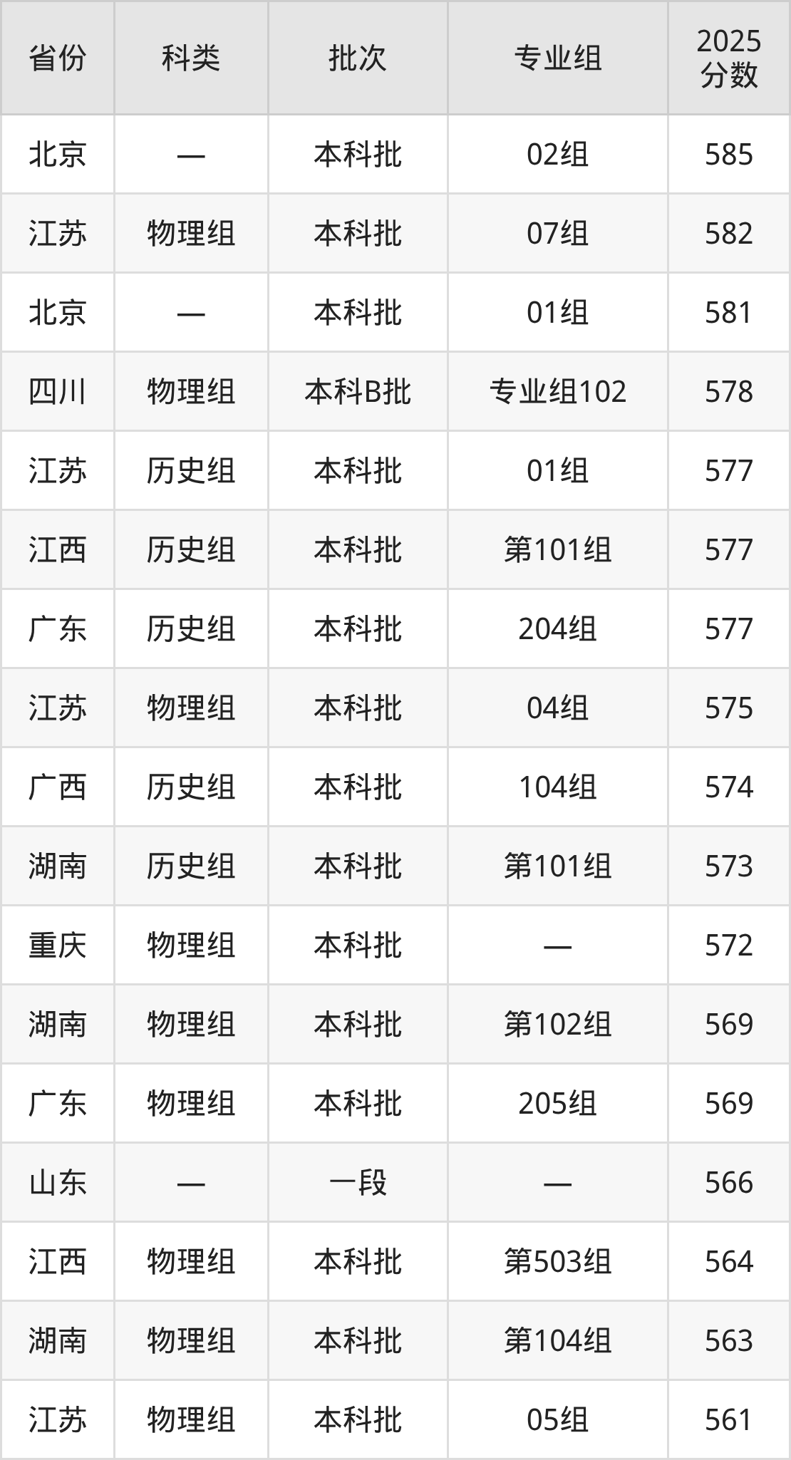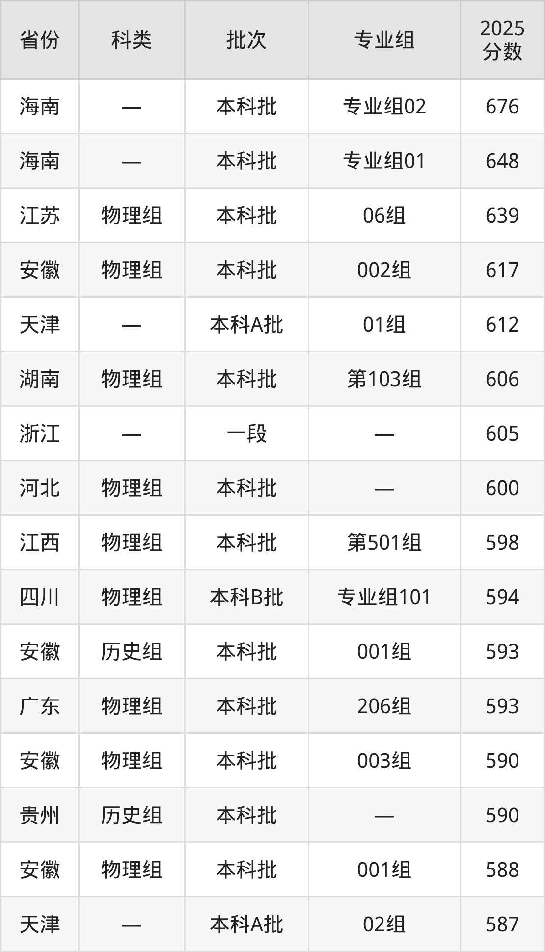 2025年南京医科大学在全国普通批次招生的录取分数范围位于518~676分之间,其中省内分数范围为561分~639分,物理组最低分专业组为“05组”,考生561分即可报考,历史组最低分专业组为“01组”,考生577分即可报考。