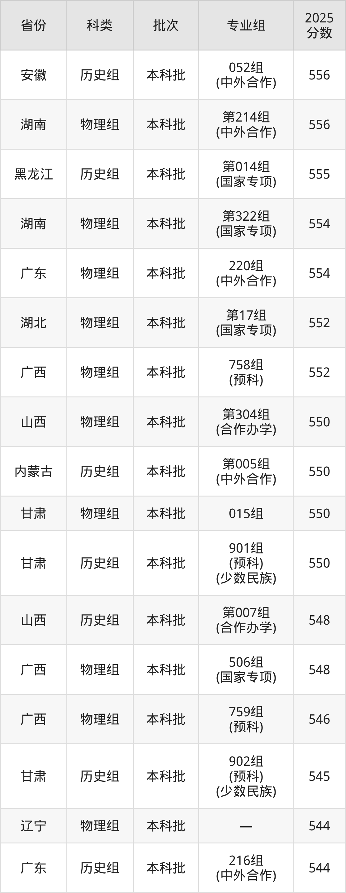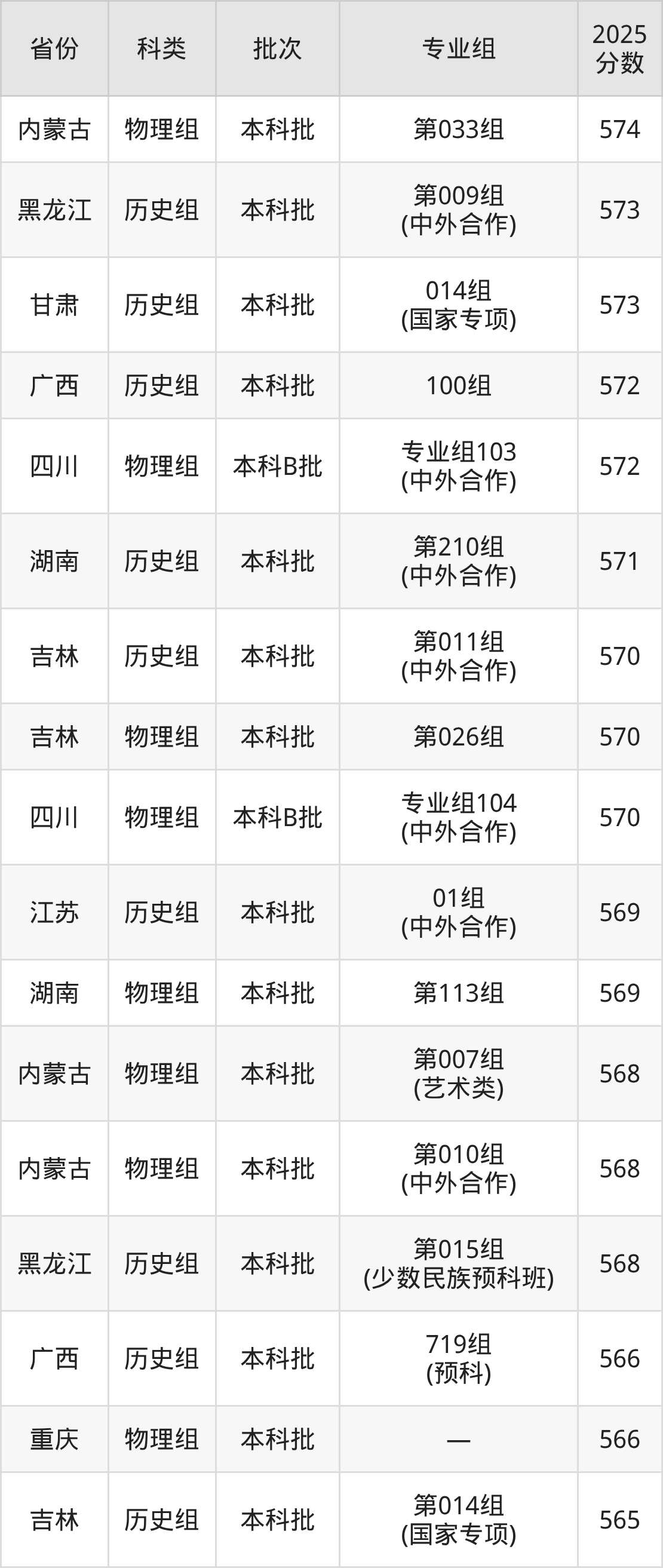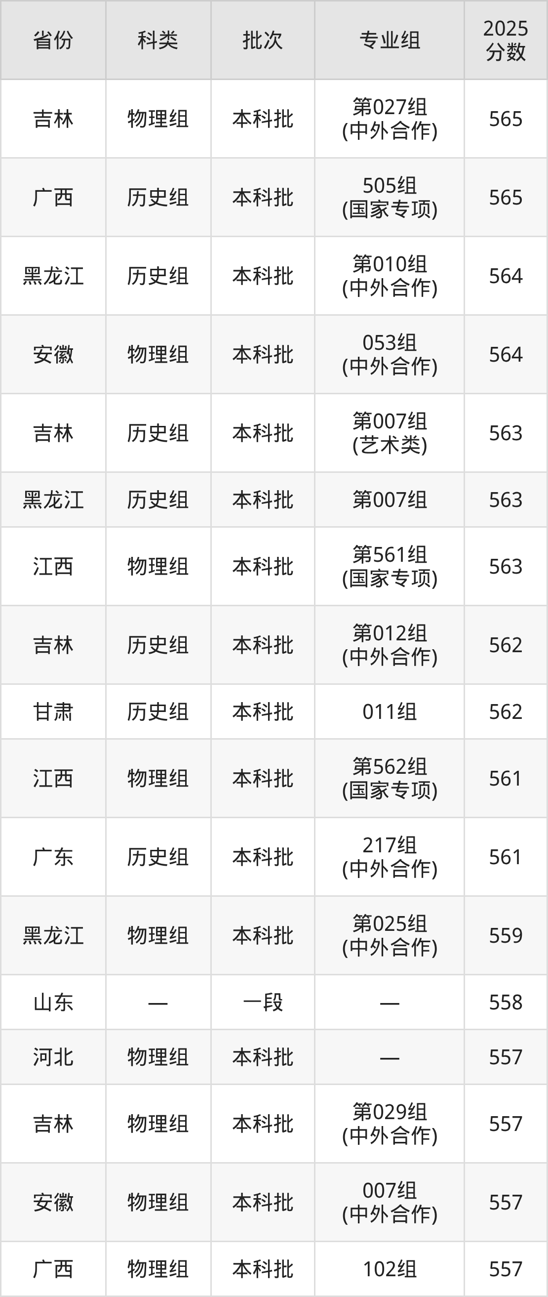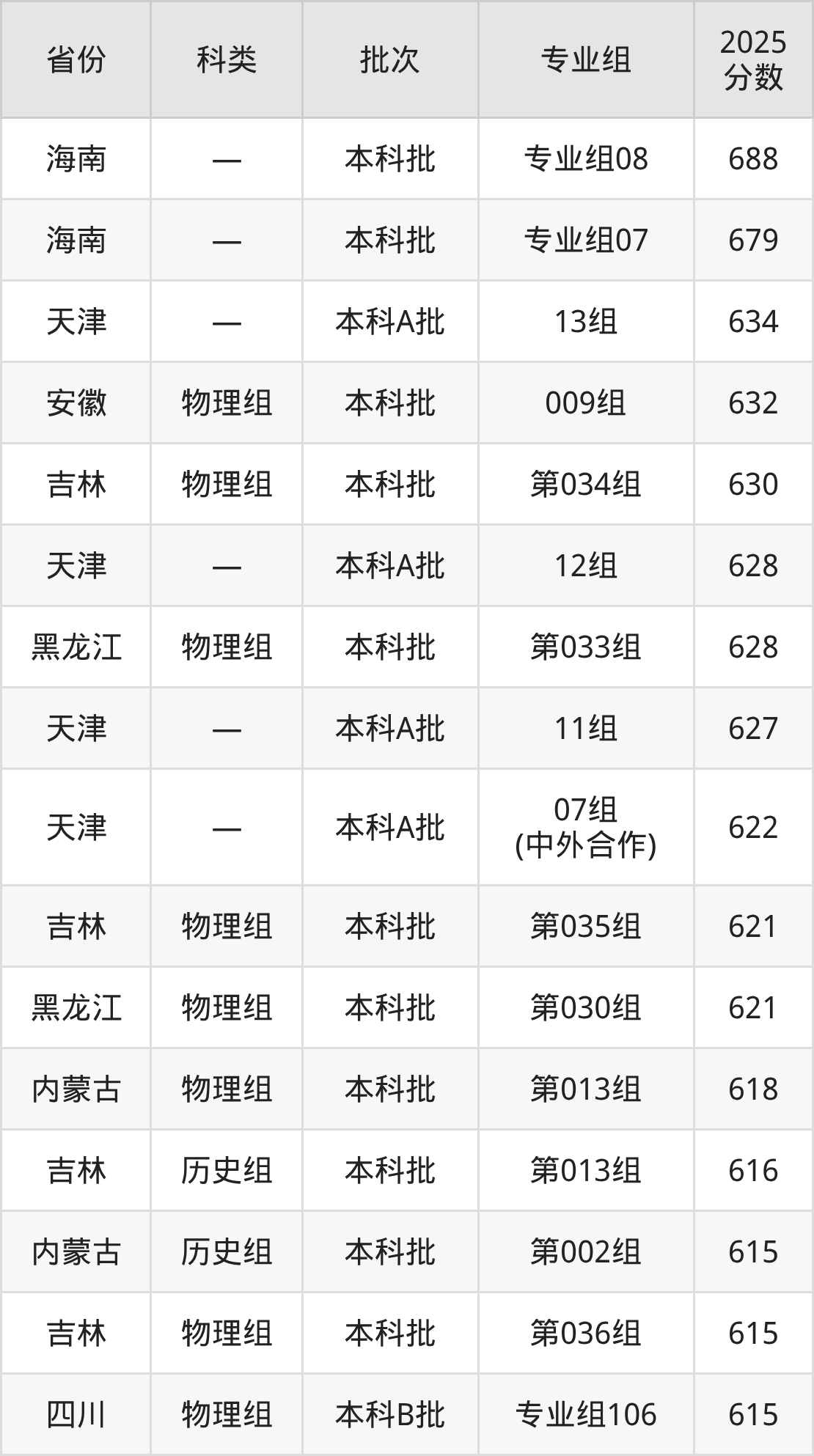 2025年东北师范大学在全国普通批次招生的录取分数范围位于468~688分之间,其中省内分数范围为540分~630分,物理组最低分专业组为“第030组(中外合作)”,考生540分即可报考,历史组最低分专业组为“第012组(中外合作)”,考生562分即可报考。