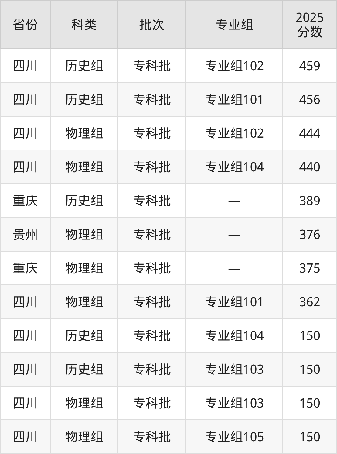 2025年乐山职业技术学院在全国普通批次招生的录取分数范围位于150~459分之间,其中省内分数范围为150分~459分,历史组最低分专业组为“专业组104”,考生150分即可报考,物理组最低分专业组为“专业组103”,考生150分即可报考。