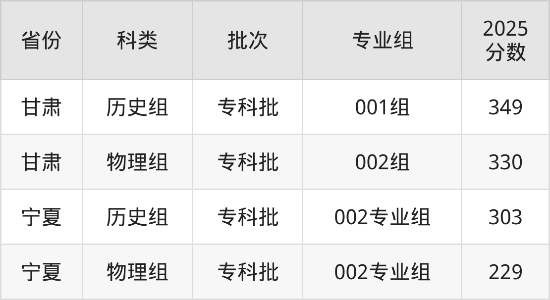 下面是宁夏民族职业技术学院2025年在全国各省的录取分数线一览表,供参考: