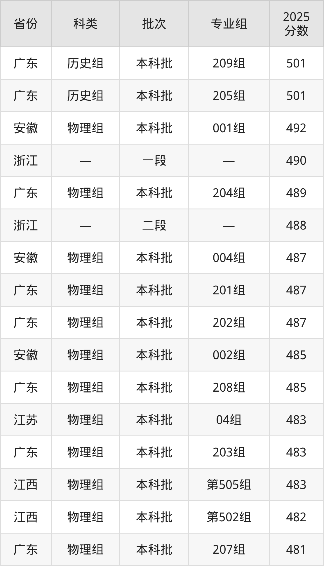 而安徽地区物理组考生的分数门槛最高,2025年电子科技大学中山学院001组在安徽招生最低分为492分,考生至少要超本科线31分才有可能被录取。