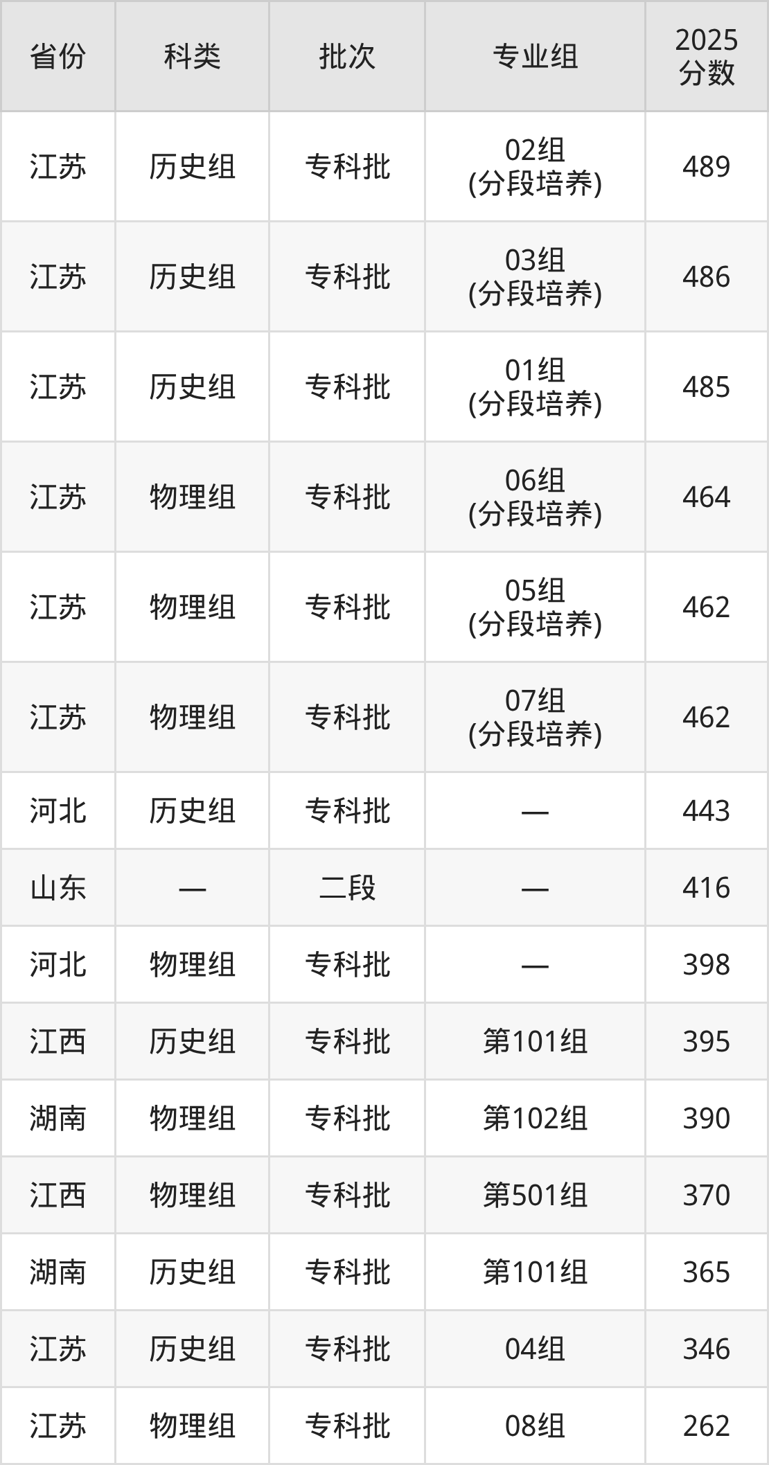 2025年盐城工业职业技术学院在全国普通批次招生的录取分数范围位于262~489分之间,其中省内分数范围为262分~489分,历史组最低分专业组为“04组”,考生346分即可报考,物理组最低分专业组为“08组”,考生262分即可报考。