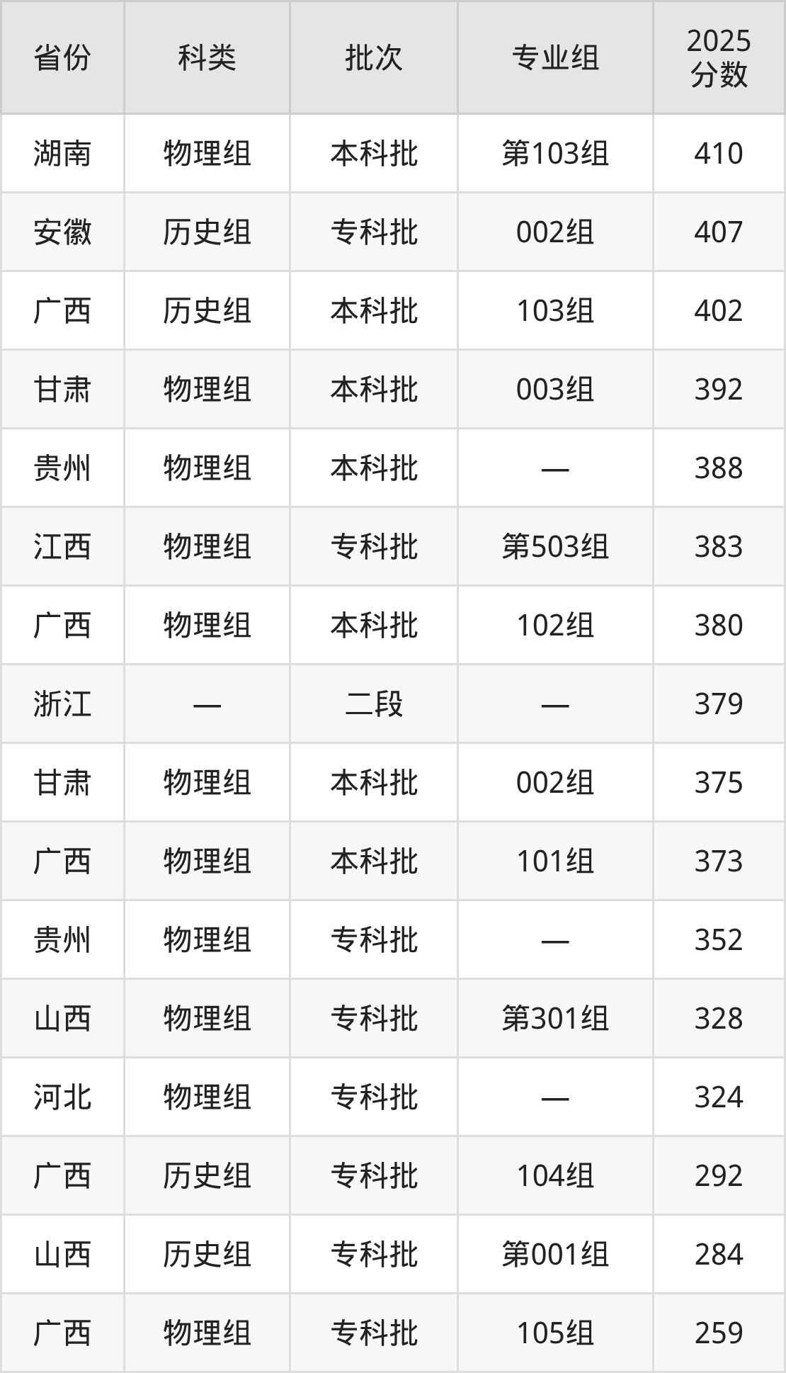 温州商学院在省外招生的最低分为259分,其中广西地区物理组考生上温州商学院的分数门槛最低,考生成绩超专科线59分(259分)可上。其次是山西历史组考生,上温州商学院至少要超专科线184分(284分)。