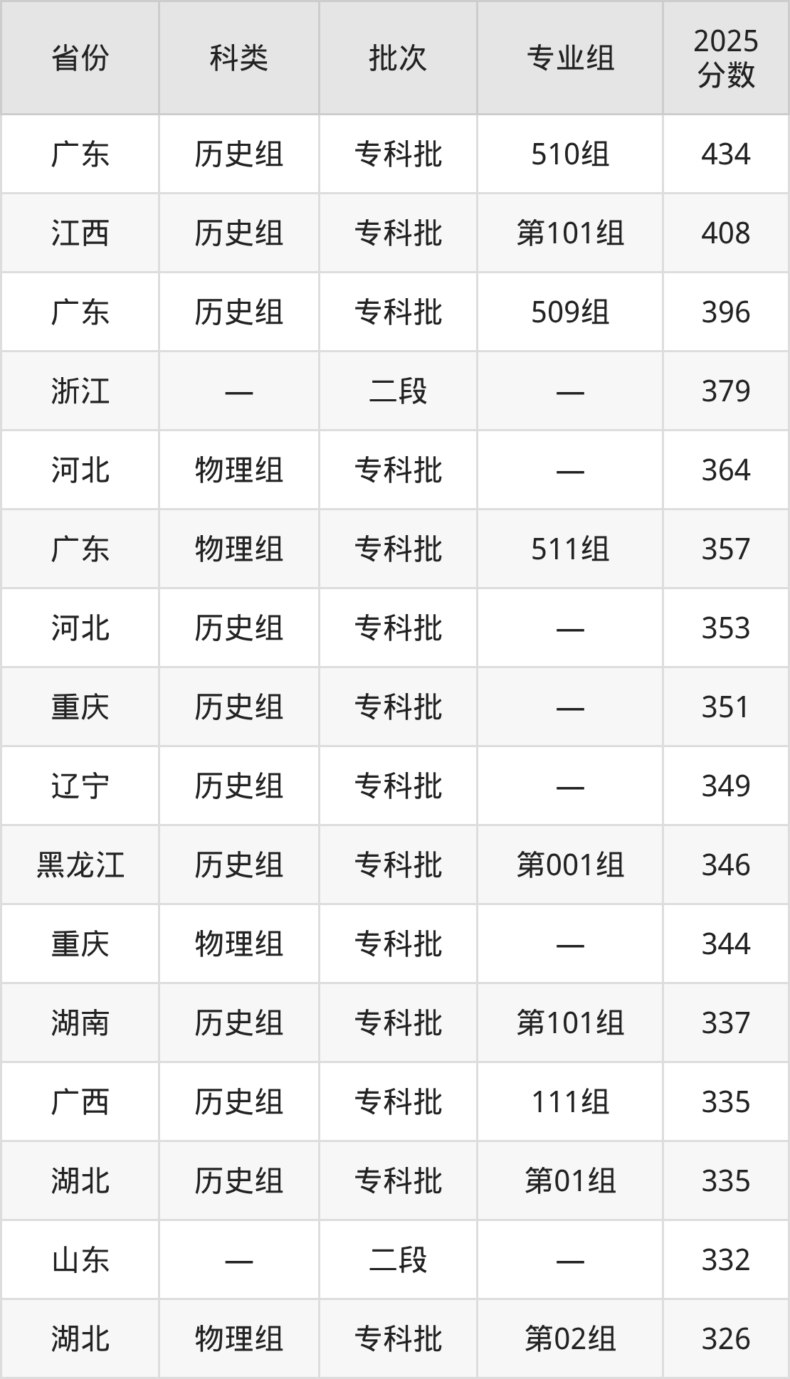 而广东地区历史组考生的分数门槛最高,2025年广西幼儿师范高等专科学校510组在广东招生最低分为434分,考生至少要超专科线219分才有可能被录取。